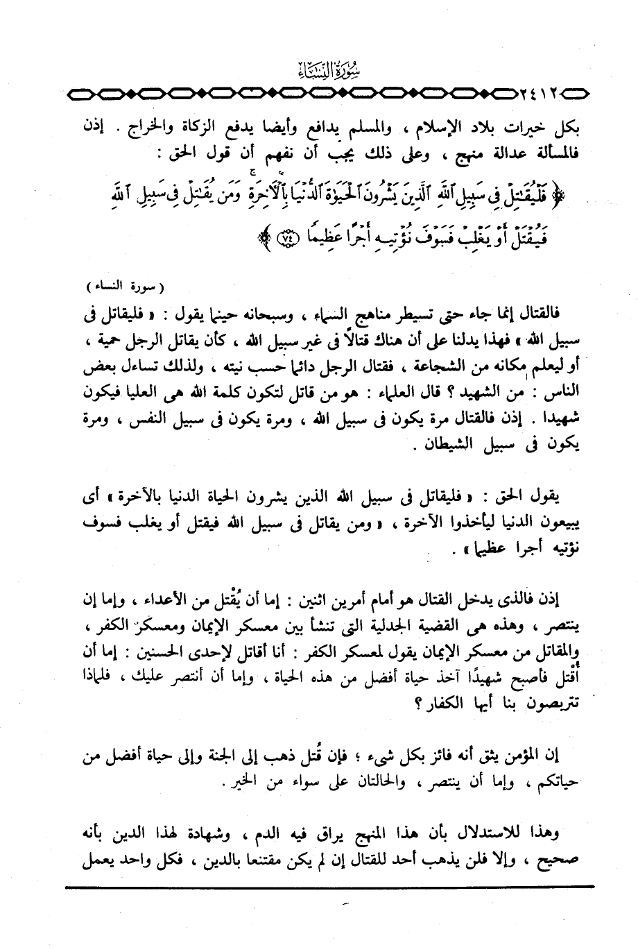 {فَلْيُقَاتِلْ فِي سَبِيلِ الله الذين يَشْرُونَ الحياة الدنيا بالآخرة وَمَن يُقَاتِلْ فِي سَبِيلِ الله فَيُقْتَلْ أَو يَغْلِبْ فَسَوْفَ نُؤْتِيهِ أَجْراً عَظِيماً} [النساء: 74] .