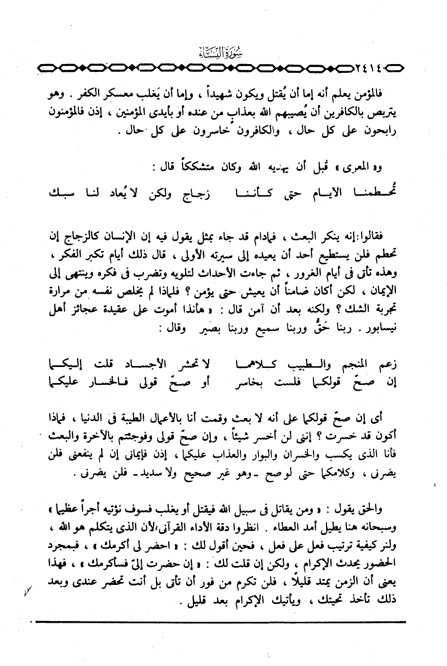 فقالوا: إنه ينكر البعث، فما دام قد جاء بمثل يقول فيه إن الإنسان كالزجاج إن تحطم فلن يستطيع أحد أن يعيده إلى سيرته الأولى، قال ذلك أيام تكبر الفكر، وهذه تأتي في أيام الغرور، ثم جاءت الأحداث لتلويه وتضرب في فكره وينتهي إلى الإيمان، لكن أكان ضامناً أن يعيش حتى يؤمن؟ فلماذا لم يخلص نفسه من مرارة تجربة الشك؟ ولكنه بعد أن آمن قال: «هأنذا أموت على عقيدة عجائز أهل نيسابور. ربنا حَقُّ وربنا سميع وربنا بصير وقال: