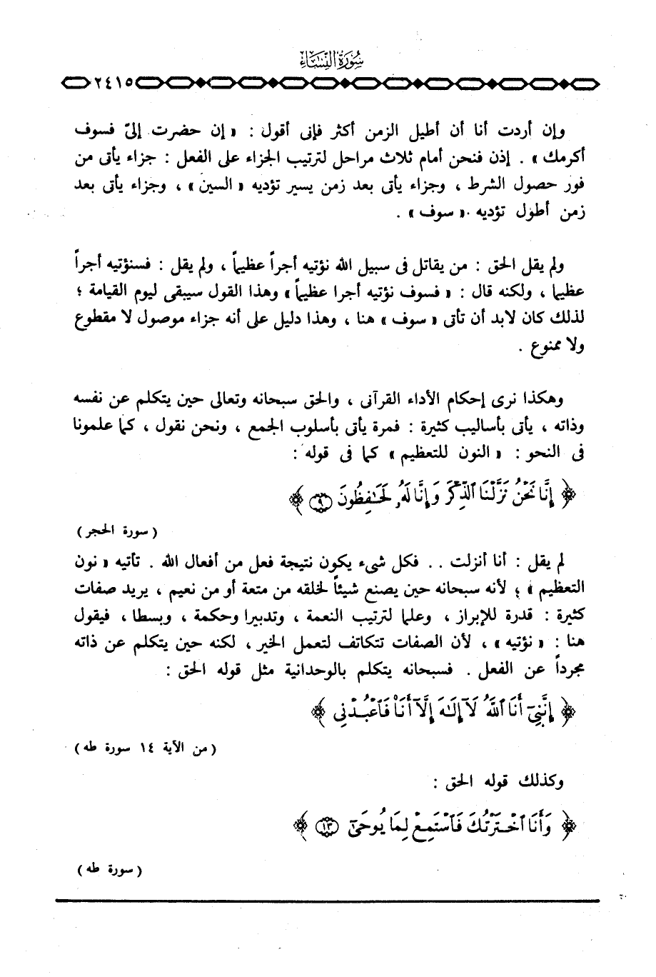 وهكذا نرى إحكام الأداء القرآني، والحق سبحانه وتعالى حين يتكلم عن نفسه وذاته، يأتي بأساليب كثيرة: فمرة يأتي بأسلوب الجمع، ونحن نقول، كما علمونا في النحو: «النون للتعظيم» كما في قوله: {إِنَّا نَحْنُ نَزَّلْنَا الذكر وَإِنَّا لَهُ لَحَافِظُونَ} [الحجر: 9] .
