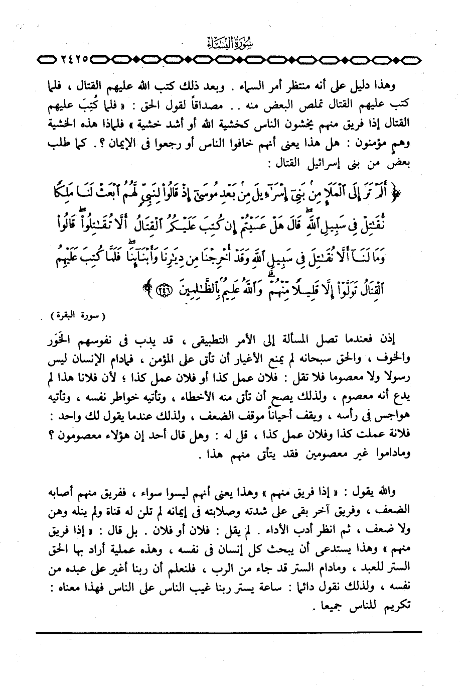 وهذا دليل على أنه منتظر أمر السماء. وبعد ذلك كتب الله عليهم القتال، فلما كتب عليهم القتال تملص البعض منه. . مصداقاً لقول الحق: {فَلَمَّا كُتِبَ عَلَيْهِمُ القتال إِذَا فَرِيقٌ مِّنْهُمْ يَخْشَوْنَ الناس كَخَشْيَةِ الله أَوْ أَشَدَّ خَشْيَةً} فلماذا هذه الخشية وهم مؤمنون: هل هذا يعني أنهم خافوا الناس أو رجعوا في الإيمان؟ . كما طلب بعض من بني إسرائيل القتال: {أَلَمْ تَرَ إِلَى الملإ مِن بني إِسْرَائِيلَ مِن بَعْدِ موسى إِذْ قَالُواْ لِنَبِيٍّ لَّهُمُ ابعث لَنَا مَلِكاً نُّقَاتِلْ فِي سَبِيلِ الله قَالَ هَلْ عَسَيْتُمْ إِن كُتِبَ عَلَيْكُمُ القتال أَلاَّ تُقَاتِلُواْ قَالُواْ وَمَا لَنَآ أَلاَّ نُقَاتِلَ فِي سَبِيلِ الله وَقَدْ أُخْرِجْنَا مِن دِيَارِنَا وَأَبْنَآئِنَا فَلَمَّا كُتِبَ عَلَيْهِمُ القتال تَوَلَّوْاْ إِلاَّ قَلِيلاً مِّنْهُمْ والله عَلِيمٌ بالظالمين} [البقرة: 246] .