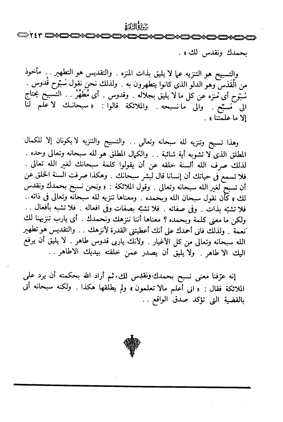 وهذا تسبيح وتنزيه لله سبحانه وتعالى. . والتسبيح والتنزيه لا يكونان إلا للكمال المطلق الذي لا تشوبه أية شائبة. . والكمال المطلق هو لله سبحانه وتعالى وحده. لذلك صرف الله ألسنة خلقه عن أن يقولوا كلمة سبحانك لغير الله تعالى. فلا تسمع في حياتك أن إنسانا قال لبشر سبحانك. وهكذا صرفت ألسنة الخلق عن أن تسبح لغير الله سبحانه وتعالى. وقول الملائكة: {وَنَحْنُ نُسَبِّحُ بِحَمْدِكَ وَنُقَدِّسُ لَكَ} كأن نقول سبحان الله وبحمده. ومعناها تنزيه لله سبحانه وتعالى في ذاته. . فلا تشبّه بذات. وفي صفاته. فلا تشبّه بصفات وفي أفعاله. فلا تشبه بأفعال. . ولكن ما معنى كلمة وبحمده؟ معناها أننا ننزهك ونحمدك. أي يا رب تنزيهنا لك نعمة. ولذلك فإني أحمدك على أنك أعطيتني القدرة لأنزهك. . والتقديس هو تطهير الله سبحانه وتعالى من كل الأغيار. ولأنك يا ربي قدوس طاهر. لا يليق أن يرفع إليك إلا طاهر. ولا يليق أن يصدر عمن خلقته بيديك إلا طاهر. .
