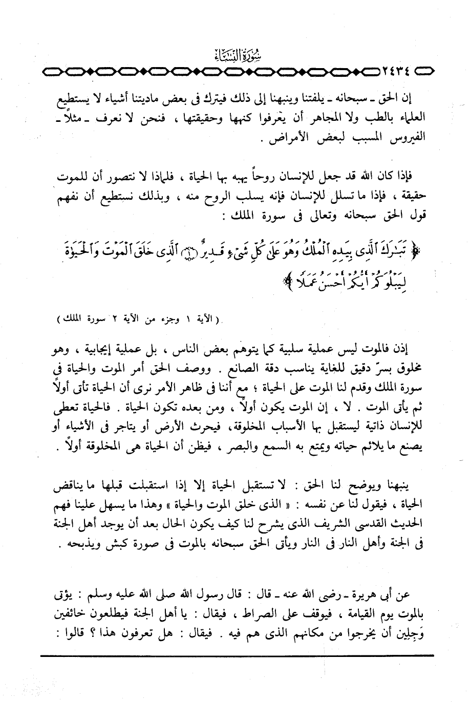 ينبهنا ويوضح لنا الحق: لا تستقبل الحياة إلا إذا استقبلت قبلها ما يناقض الحياة، فيقول لنا عن نفسه: {الذي خَلَقَ الموت والحياة} وهذا ما يسهل علينا فهم الحديث القدسي الشريف الذي يشرح لنا كيف يكون الحال بعد أن يوجد أهل الجنة في الجنة وأهل النار في النار ويأتي الحق سبحانه بالموت في صورة كبش ويذبحه.