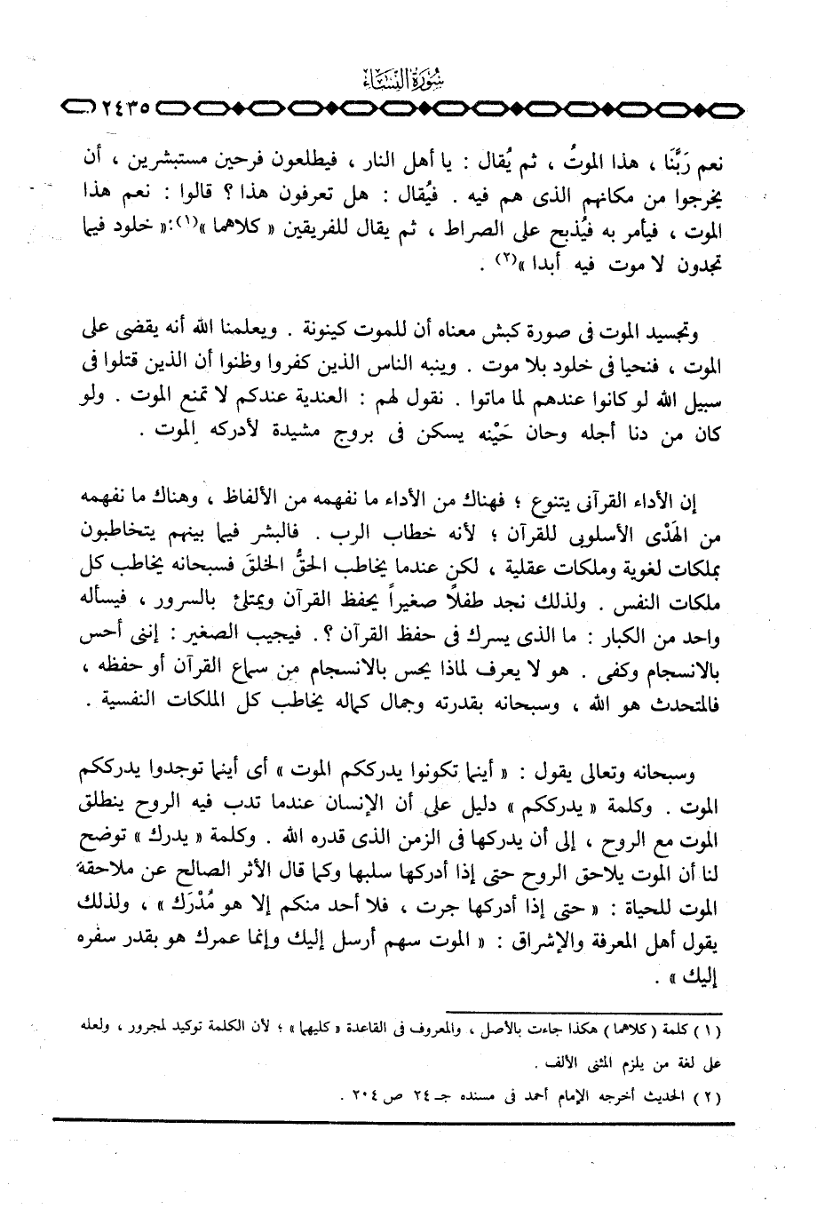 نعم رَبَّنَا، هذا الموتُ، ثم يُقال: يا أهل النار، فيطلعون فرحين مستبشرين، أن يخرجوا من مكانهم الذي هم فيه. فيُقال: هل تعرفون هذا؟ قالوا: نعم هذا الموت، فيأمر به فيًُذبح على الصراط، ثم يقال للفريقين» كلاهما «» خلود فيما تجدون لا موت فيه أبدا «» .