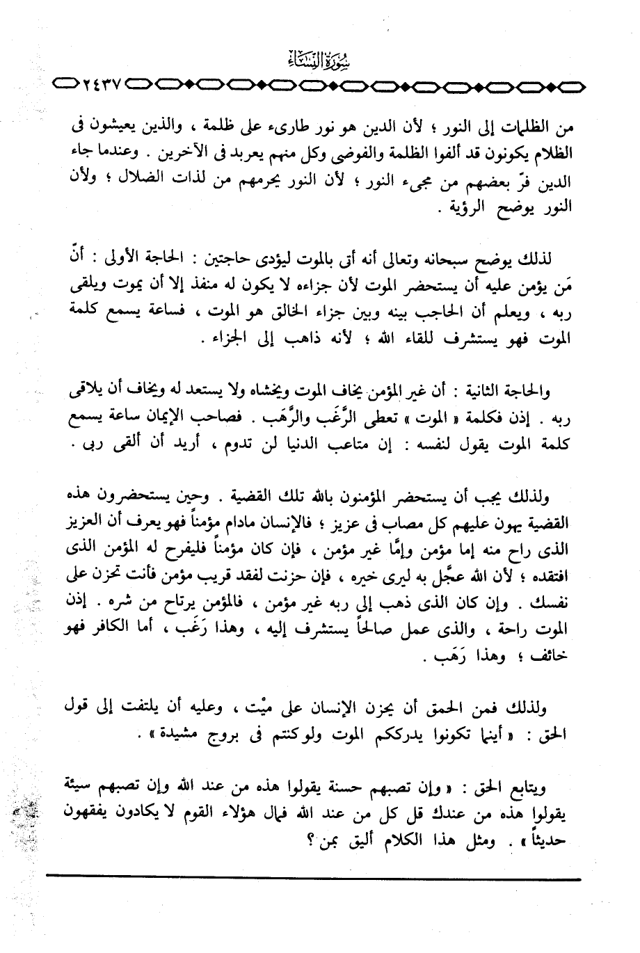 من الظلمات إلى النور؛ لأن الدين هو نور طارئ على ظلمة، والذين يعيشون في الظلام يكونون قد ألفوا الظلمة والفوضى وكل منهم يعربد في الآخرين. وعندما جاء الدين فرّ بعضهم من مجيء النور؛ لأن النور يحرمهم من لذات الضلال؛ ولأن النور يوضح الرؤية.
