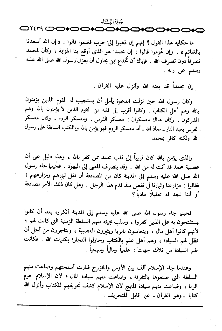 والذي يؤمن بالله كان قريباً إلى قلب محمد ممن كفر بالله، وهذا دليل على أن عصبية محمد قد أتت له من الله. وقد ينصرف المعنى إلى اليهود. فحينما جاء رسول الله صَلَّى اللَّهُ عَلَيْهِ وَسَلَّم َ إلى المدينة كان من المصادفة أن تقل ثمارهم ومزارعهم؛ فقالوا: مزارعنا وثمارنا في نقص منذ قدم هذا الرجل. وهل كان ذلك الأمر مصادفة أو أننا نجد له تعليلاً مادياً؟