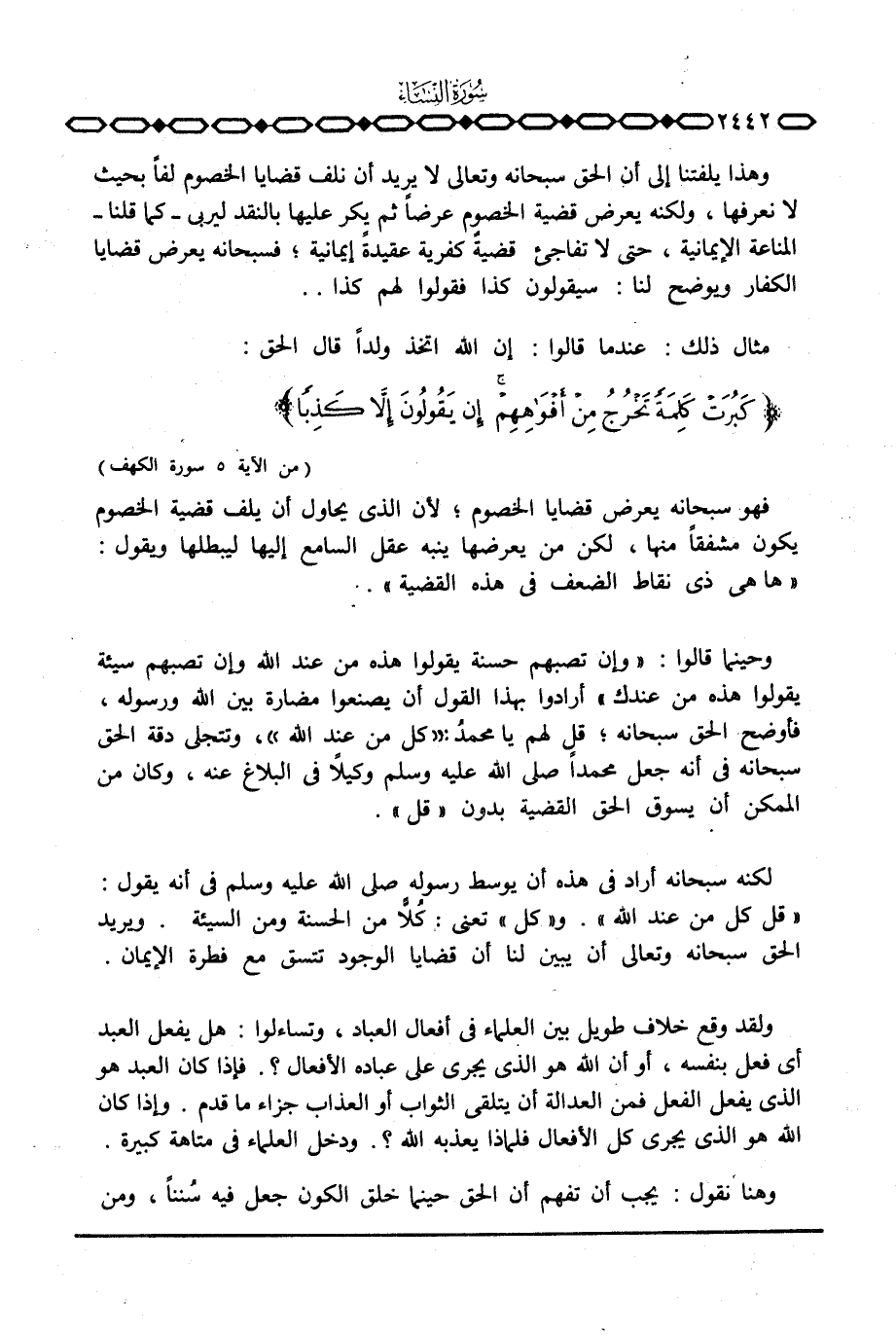 ولقد وقع خلاف طويل بين العلماء في أفعال العباد، وتساءلوا: هل يفعل العبد أي فعل بنفسه، أو أن الله هو الذي يجري على عباده الأفعال؟ . فإذا كان العبد هو الذي يفعل الفعل فمن العدالة أن يتلقى الثواب أو العذاب جزاء ما قدم. وإذا كان الله هو الذي يجري كل الأفعال فلماذا يعذبه الله؟ . ودخل العلماء في متاهة كبيرة.
