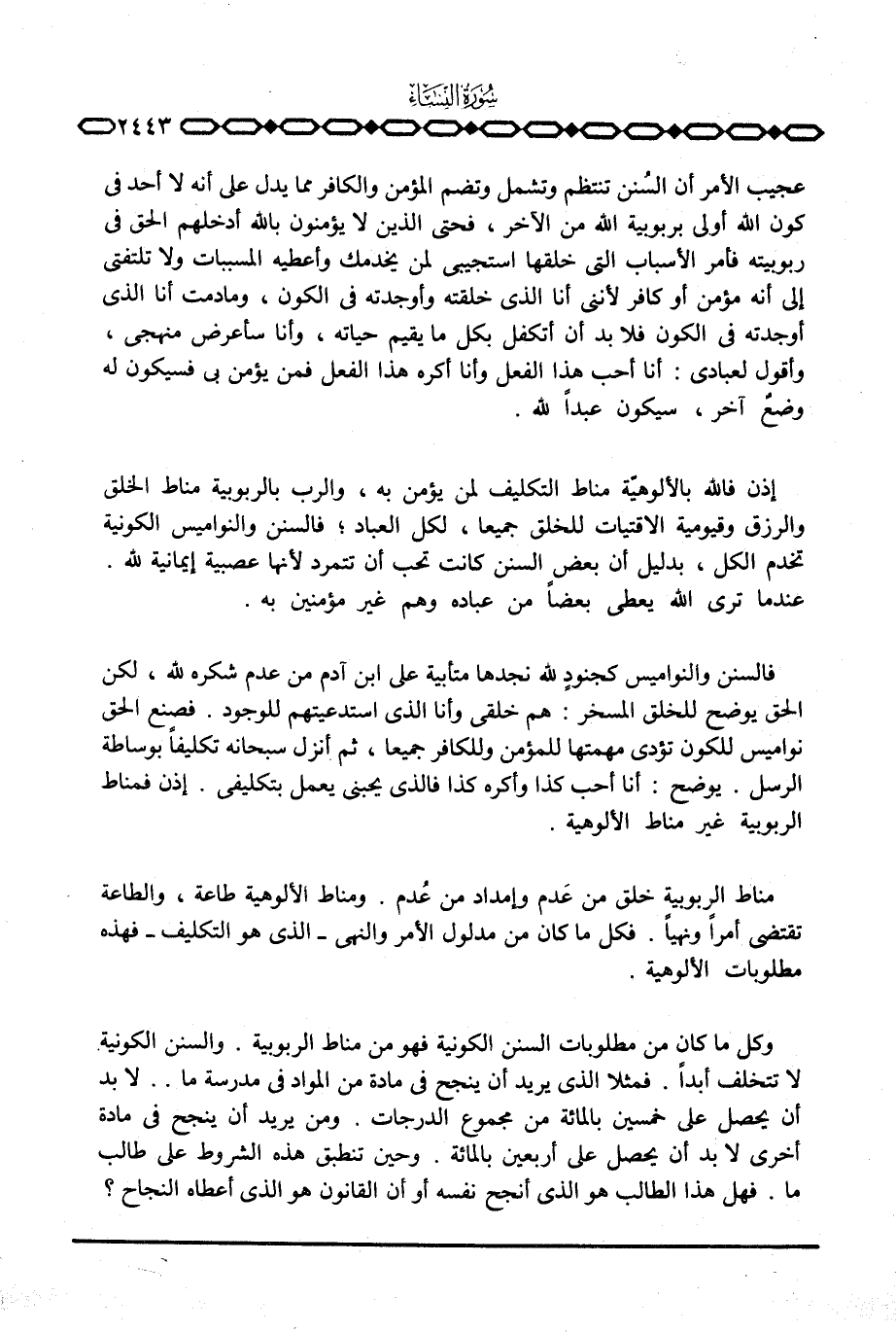 فالسنن والنواميس كجنودٍ لله نجدها متأبية على ابن آدم من عدم شكره لله، لكن الحق يوضح للخلق المسخر: هم خلقي وأنا الذي استدعيتهم للوجود. فصنع الحق نواميس للكون تؤدي مهمتها للمؤمن وللكافر جميعا، ثم أنزل سبحانه تكليفاً بوساطة الرسل. ويوضح: أنا أحب كذا وأكره فالذي يحبني يعمل بتكليفي. إذن فمناط الربوبية غير مناط الألوهية.