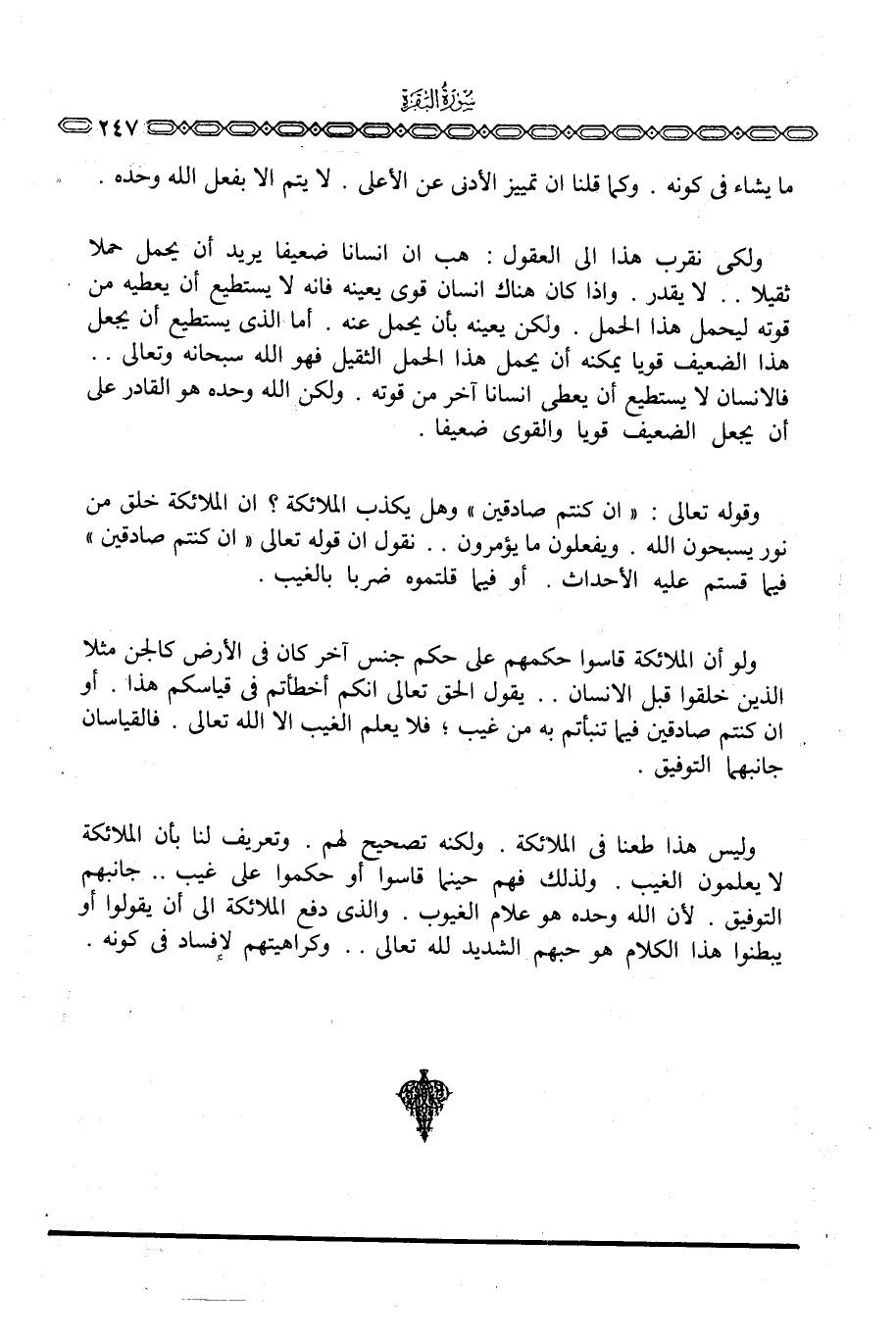 ولكي نقرب هذا إلى العقول: هب أن إنسانا ضعيفا يريد أن يحمل حملا ثقيلا. . لا يقدر. وإذا كان هناك إنسان قوي يعينه فإنه لا يستطيع أن يعطيه من قوته ليحمل هذا الحمل. ولكن يعينه بأن يحمل عنه. أما الذي يستطيع أن يجعل هذا الضعيف قويا يمكنه أن يحمل هذا الحمل الثقيل فهو الله سبحانه وتعالى. . فالإنسان لا يستطيع أن يعطي إنسانا آخر من قوته. ولكن الله وحده هو القادر على أن يجعل الضعيف قويا والقوي ضعيفا.