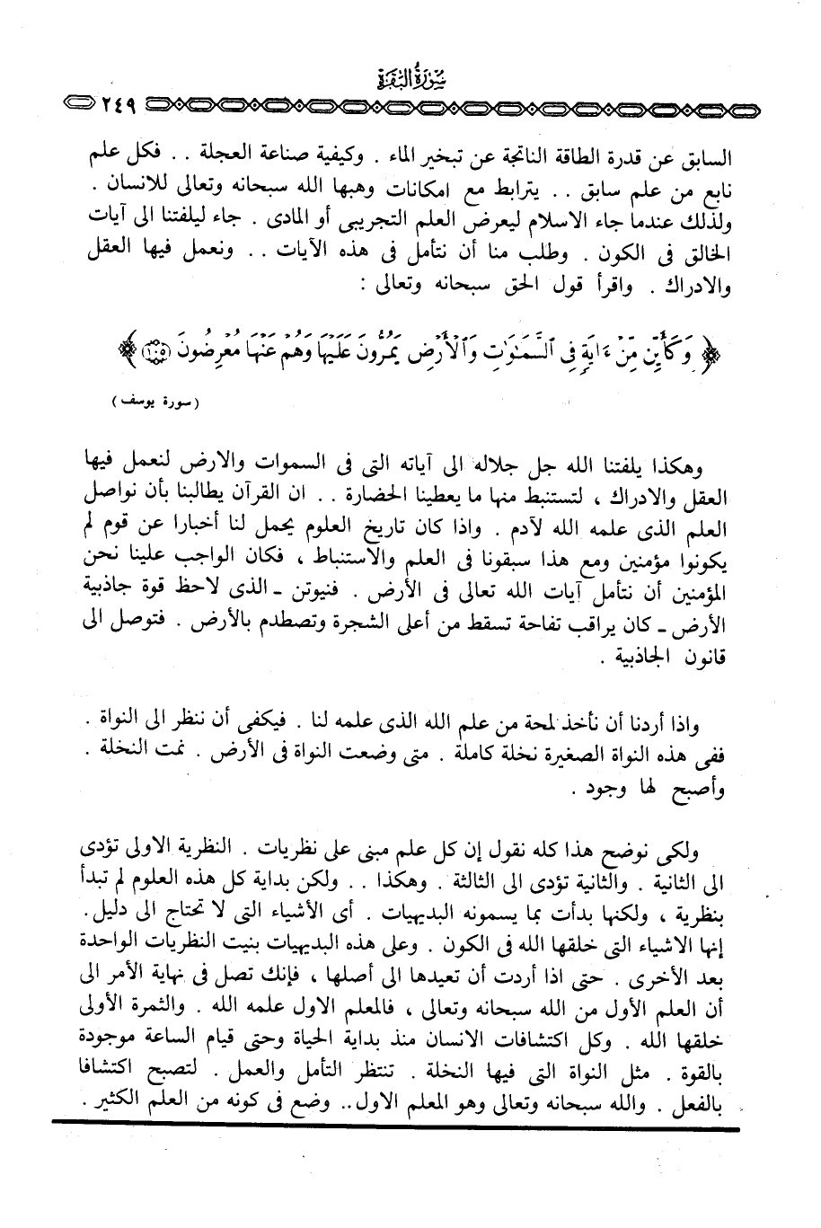 السابق عن قدرة الطاقة الناتجة عن تبخير الماء. وكيفية صناعة العجلة. . فكل علم نابع من علم سابق. . يترابط مع إمكانات وهبها الله سبحانه وتعالى للإنسان. ولذلك عندما جاء الإسلام ليعرض العلم التجريبي أو المادي. جاء ليلفتنا إلى آيات الخالق في الكون. وطلب منا أن نتأمل في هذه الآيات. . ونعمل فيها العقل والإدراك. واقرأ قول الحق سبحانه وتعالى: {وَكَأَيِّن مِّن آيَةٍ فِي السماوات والأرض يَمُرُّونَ عَلَيْهَا وَهُمْ عَنْهَا مُعْرِضُونَ} [يوسف: 105]