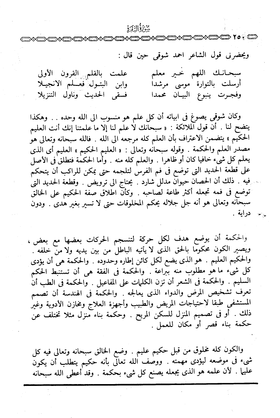 وكان شوقي يصوغ في أبياته أن كل علم هو منسوب إلى الله وحده. . وهكذا يتضح لنا. أن قول الملائكة: {سُبْحَانَكَ لاَ عِلْمَ لَنَآ إِلاَّ مَا عَلَّمْتَنَآ إِنَّكَ أَنْتَ العليم الحكيم} يتضمن الاعتراف بأن العلم كله مرجعه إلى الله. فالله سبحانه وتعالى هو مصدر العلم والحكمة. وقوله سبحانه وتعالى: {العليم الحكيم} العليم أي الذي يعلم كل شيء خافيا كان أو ظاهرا. والعلم كله منه. وأما الحكمة فتطلق في الأصل على قطعة الحديد التي توضع في فم الفرس لتلجمه حتى يمكن للراكب أن يتحكم فيه. ذلك أن الحصان حيوان مدلل شارد. يحتاج إلى ترويض. وقطعة الحديد التي توضع في فمه تجعله أكثر طاعة لصاحبه. وكأن إطلاق صفة الحكيم على الخالق سبحانه وتعالى هو أنه جل جلاله يحكم المخلوقات حتى لا تسير بغير هدى. ودون دراية.