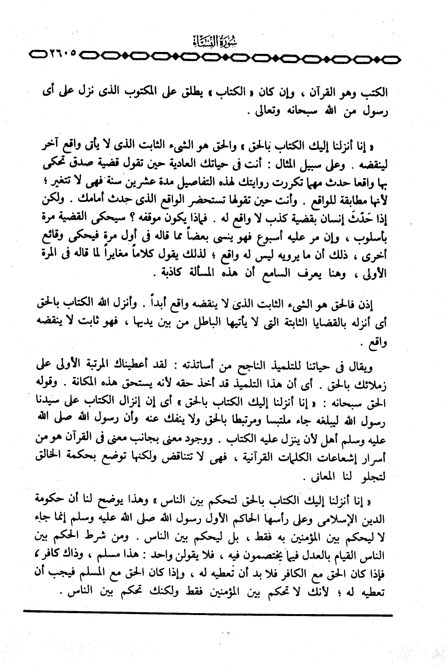 {إِنَّآ أَنْزَلْنَا إِلَيْكَ الكتاب بالحق لِتَحْكُمَ بَيْنَ الناس} وهذا يوضح لنا أن حكومة الدين الإسلامي وعلى رأسها الحاكم الأول رسول الله صَلَّى اللَّهُ عَلَيْهِ وَسَلَّم َ إنما جاء لا ليحكم بين المؤمنين به فقط، بل ليحكم بين الناس. ومن شرط الحكم بين الناس القيام بالعدل فيما يختصمون فيه، فلا يقولن واحد: هذا مسلم، وذاك كافر، فإذا كان الحق مع الكافر فلا بد أن تعطيه له، وإذا كان الحق مع المسلم فيجب أن تعطيه له؛ لأنك لا تحكم بين المؤمنين فقط ولكنك تحكم بين الناس.