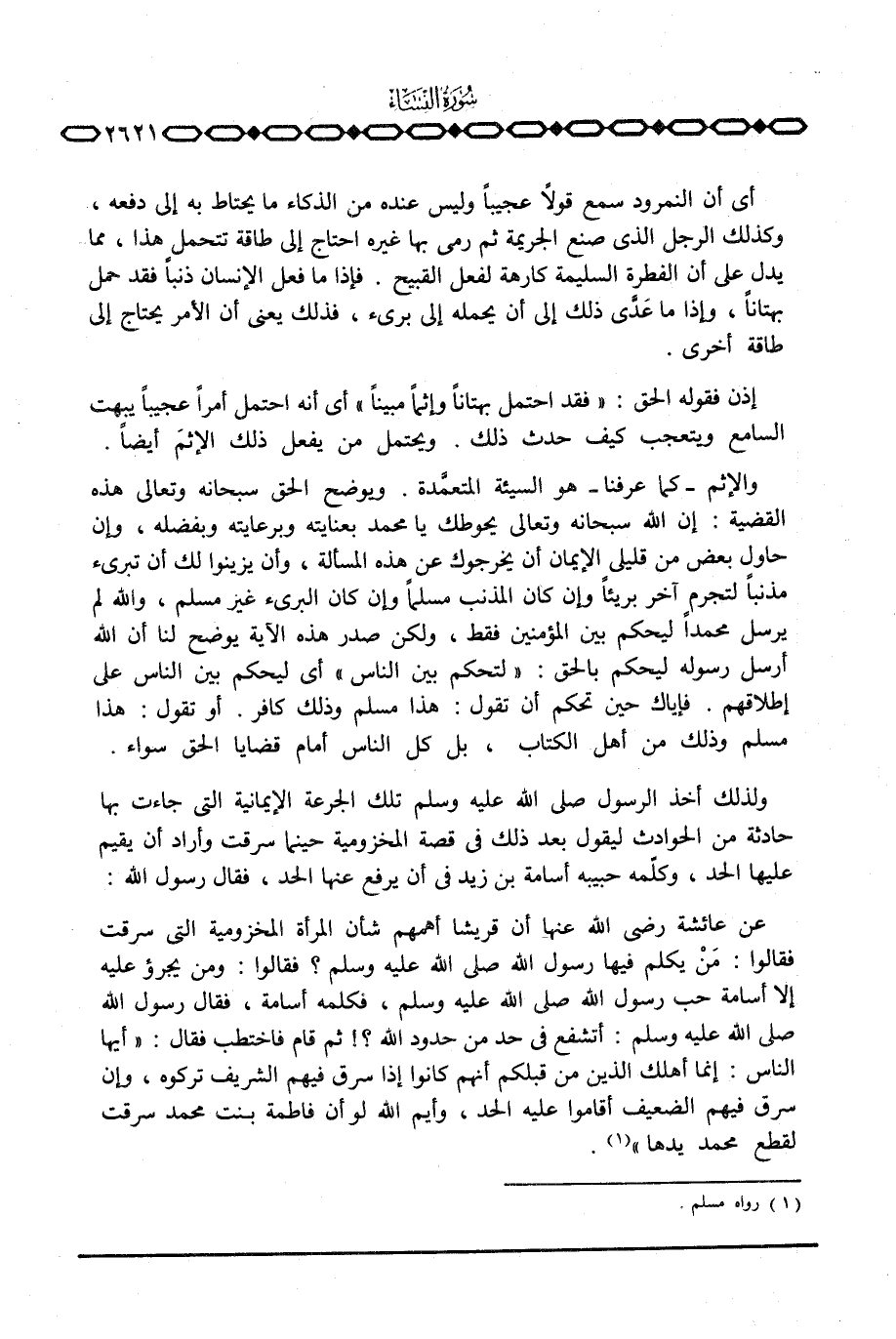 «عن عائشة رَضِيَ اللَّهُ عَنْها أن قريشا أهمهم شأن المرأة المخزومية التي سرقت فقالوا: مَنْ يكلم فيها رسول الله صَلَّى اللَّهُ عَلَيْهِ وَسَلَّم َ؟ فقالوا: ومن يجرؤ عليه إلا أسامة حب رسول الله صَلَّى اللَّهُ عَلَيْهِ وَسَلَّم َ، فكلمه أسامة، فقال رسول الله صَلَّى اللَّهُ عَلَيْهِ وَسَلَّم َ: أتشفع في حد من حدود الله؟! ثم قام فاختطب فقال:» أيها الناس: إنما أهلك الذين من قبلكم أنهم كانوا إذا سرق فيهم الشريف تركوه، وإن سرق فيهم الضعيف أقاموا عليه الحد، وأيم الله لو أن فاطمة بنت محمد سرقت لقطع محمد يدها «.