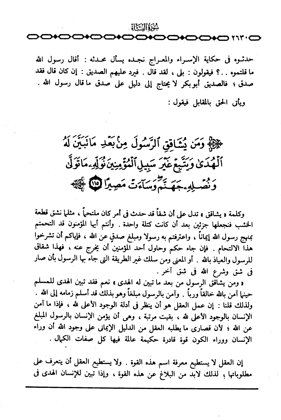 {وَمَن يُشَاقِقِ الرسول مِن بَعْدِ مَا تَبَيَّنَ لَهُ الهدى} نعم فقد تبين الهدى للمسلم حينما آمن بالله خالقاً ورباً. وآمن بالرسول مبلغاً وهو بذلك قد أسلم زمامه إلى الله. ولذلك قلنا: إن عمل العقل هو أن ينظر في أدلة الوجود الأعلى لله، فإذا ما آمن الإنسان بالوجود الأعلى لله، بقيت مرتبة، وهي أن يؤمن الإنسان بالرسول المبلغ عن الله؛ لأن قصارى ما يطلبه العقل من الدليل الإيماني على وجود الله أن وراء الإنسان ووراء الكون قوة قادرة حكيمة عالمة فيها كل صفات الكمال.
