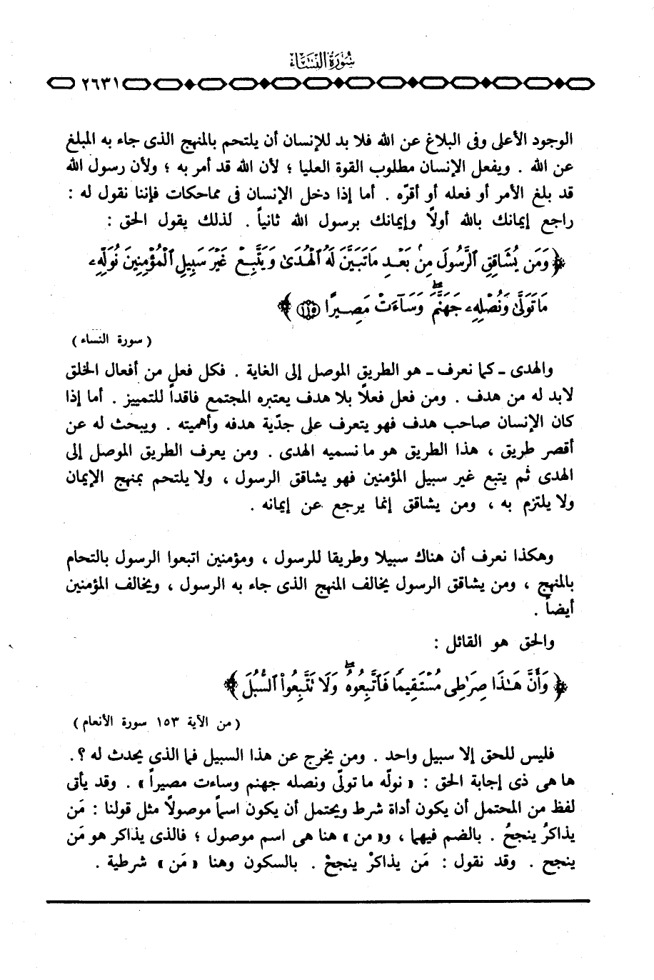 والهدى - كما نعرف - هو الطريق الموصل إلى الغاية. فكل فعل من أفعال الخلق لا بد له من هدف. ومن فعل فعلاً بلا هدف يعتبره المجتمع فاقداً للتمييز. أما إذا كان الإنسان صاحب هدف فهو يعترف على جدّية هدفه وأهميته. ويبحث له عن أقصر طريق، هذا الطريق هو ما نسميه الهدى. ومن يعرف الطريق الموصل إلى الهدى ثم يتبع غير سبيل المؤمنين فهو يشاقق الرسول، ولا يلتحم بمنهج الإيمان ولا يلتزم به، ومن يشاقق إنما يرجع عن إيمانه.