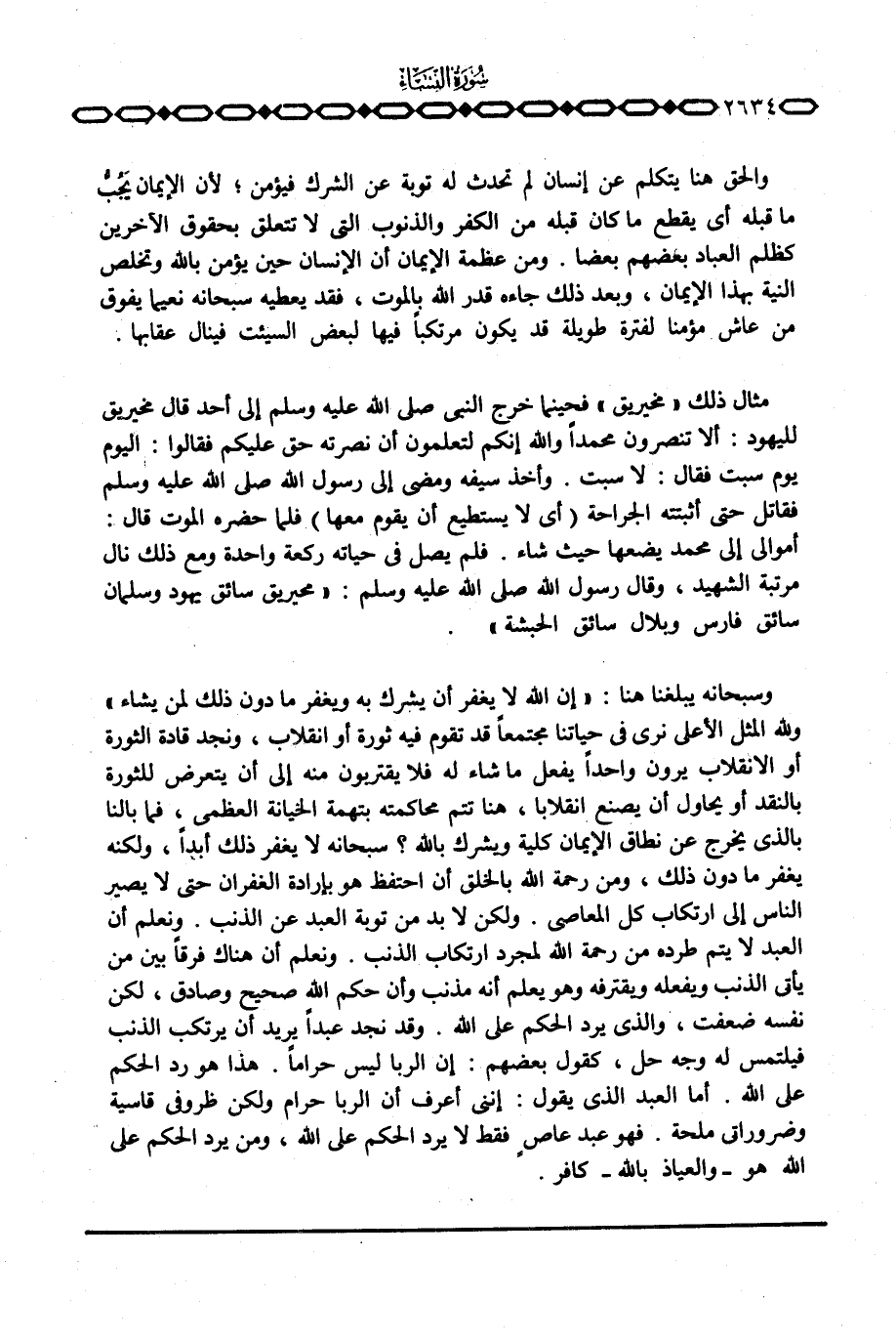 وسبحانه يبلغنا هنا: {إِنَّ الله لاَ يَغْفِرُ أَن يُشْرَكَ بِهِ وَيَغْفِرُ مَا دُونَ ذلك لِمَن يَشَآءُ} ولله المثل الأعلى نرى في حياتنا مجتمعاً قد تقوم فيه ثورة أو انقلاب، ونجد قادة الثورة أو الانقلاب يرون واحداً يفعل ما شاء له فلا يقتربون منه إلى أن يتعرض للثورة بالنقد أو يحاول أن يصنع انقلابا، هنا تتم محاكمته بتهمة الخيانة العظمى، فما بالنا بالذي يخرج عن نطاق الإيمان كلية ويشرك بالله؟ سبحانه لا يغفر ذلك أبداً، ولكنه يغفر ما دون ذلك، ومن رحمة الله بالخلق أن احتفظ هو بإرادة الغفران حتى لا يصير الناس إلى ارتكاب كل المعاصي. ولكن لا بد من توبة العبد عن الذنب. ونعلم أن العبد لا يتم طرده من رحمة الله لمجرد ارتكاب الذنب. ونعلم أن هناك فرقاً بين من يأتي الذنب ويفعله ويقترفه وهو يعلم أنه مذنب وأن حكم الله صحيح وصادق، لكن نفسه ضعفت، والذي يرد الحكم على الله. وقد نجد عبداً يريد أن يرتكب الذنب فيلتمس له وجه حل، كقول بعضهم: إن الربا ليس حراماً. هذا هو رد الحكم على الله. أما العبد الذي يقول: إنني أعرف أن الربا حرام ولكن ظروفي قاسية وضروراتي ملحة. فهو عبد عاصٍ فقط لا يرد الحكم على الله، ومن يرد الحكم على الله هو - والعياذ بالله - كافر.