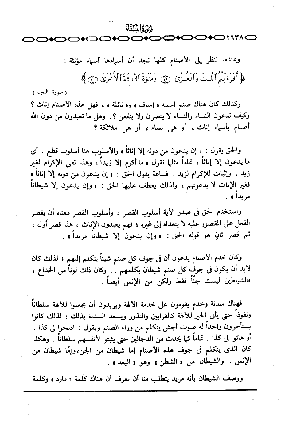 والحق يقول: {إِن يَدْعُونَ مِن دُونِهِ إِلاَّ إِنَاثاً} والأسلوب هنا أسلوب قطع. أي ما يدعون إلا إناثاً، تماماً مثلما نقول «ما أكرم إلا زيداً» وهذا نفي الإكرام لغير زيد، وإثبات للإكرام لزيد. فساعة يقول الحق: {إِن يَدْعُونَ مِن دُونِهِ إِلاَّ إِنَاثاً} فغير الإناث لا يدعونهم، ولذلك يعطف عليها الحق: {وَإِن يَدْعُونَ إِلاَّ شَيْطَاناً مَّرِيداً} .