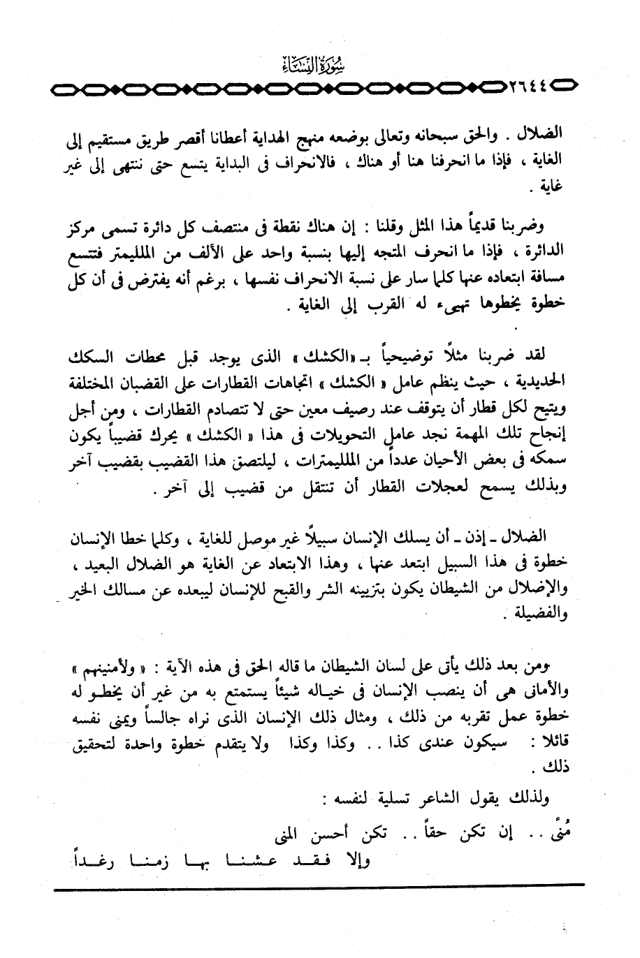 وضربنا قديماً هذا المثل وقلنا: إن هناك نقطة في منتصف كل دائرة تسمى مركز الدائرة، فإذا ما انحرف المتجه إليها بنسبة واحد على الألف من الملليمتر فتتسع مسافة ابتعاده عنها كلما سار على نسبة الانحراف نفسها، برغم أنه يفترض في أن كل خطوة يخطوها تهيئ له القرب إلى الغاية.