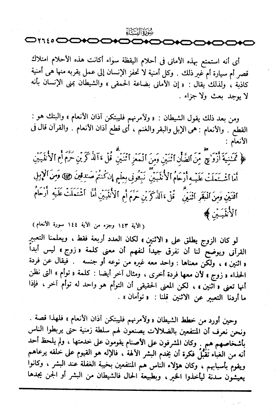 ومن بعد ذلك يقول الشيطان: {وَلأَمُرَنَّهُمْ فَلَيُبَتِّكُنَّ آذَانَ الأنعام} والبتك هو: القطع. والأنعام: هي الإبل والبقر والغنم، أي قطع آذان الأنعام. والقرآن قال في الأنعام: {ثَمَانِيَةَ أَزْوَاجٍ مَّنَ الضأن اثنين وَمِنَ المعز اثنين قُلْءَآلذَّكَرَيْنِ حَرَّمَ أَمِ الأنثيين أَمَّا اشتملت عَلَيْهِ أَرْحَامُ الأنثيين نَبِّئُونِي بِعِلْمٍ إِن كُنتُمْ صَادِقِينَ وَمِنَ الإبل اثنين وَمِنَ البقر اثنين قُلْءَآلذَّكَرَيْنِ حَرَّمَ أَمِ الأنثيين أَمَّا اشتملت عَلَيْهِ أَرْحَامُ الأنثيين} [الأنعام: 143 - 144]