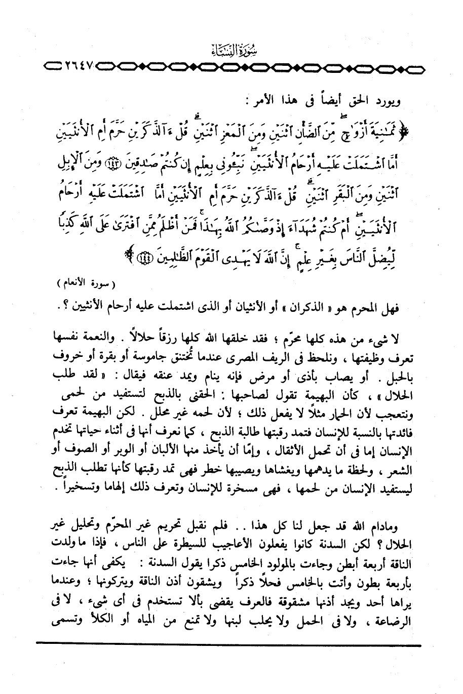 لا شيء من هذه كلها محرّم؛ فقد خلقها الله كلها رزقاً حلالاً. والنعمة نفسها تعرف وظيفتها، ونلحظ في الريف المصري عندما تُختنق جاموسة أو بقرة أو خروف بالحبل. أو يصاب بأذى أو مرض فإنه ينام ويمد عنقه فيقال: «لقد طلب الحلال» ، كأن البهيمة تقول لصاحبها: الحقني بالذبح لتستفيد من لحمي ونتعجب لأن الحمار مثلاً لا يفعل ذلك؛ لأن لحمه غير محلل. لكن البهيمة تعرف فائدتها بالنسبة للإنسان فتمد رقبتها طالبة الذبح، كما نعرف أنها في أثناء حياتها تخدم الإنسان إما في أن تحمل الأثقال، وإمّا أن يأخذ منها الألبان أو الوبر أو الصوف أو الشعر، ولحظة ما يدهمها ويغشاها ويصيبها خطر فهي تمد رقبتها كأنها تطلب الذبح ليستفيد الإنسان من لحمها، فهي مسخرة للإنسان وتعرف ذلك إلهاما وتسخيراً.