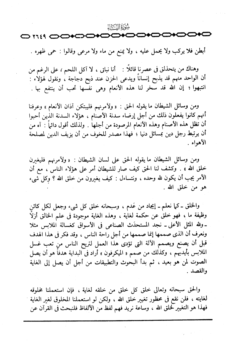 ومن وسائل الشيطان ما يقوله الحق: {وَلأَمُرَنَّهُمْ فَلَيُبَتِّكُنَّ آذَانَ الأنعام} وعرفنا أنهم كانوا يفعلون ذلك من اجل إرضاء سدنة الأصنام، هؤلاء السدنة الذين أحبوا أن تظل هذه الأصنام وهذه الأنعام المرصودة من أجلها. ولذلك أقول دائماً: آه من أن يرتبط رجل دين بمسائل دنيا؛ فهذا مصدر للخوف من أن يزيف الدين لمصلحة الأهواء.