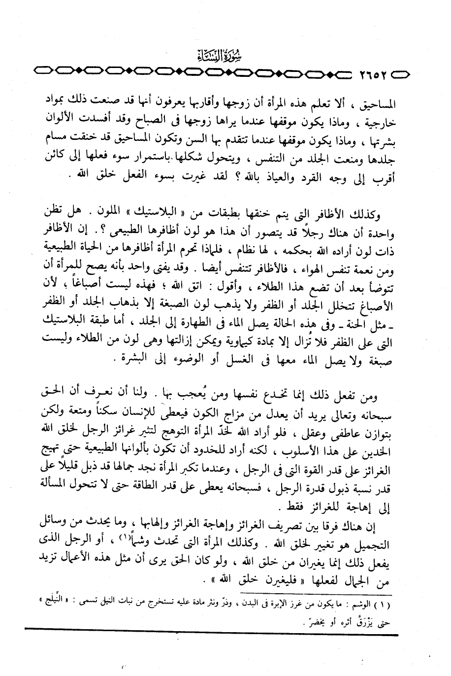 المساحيق، ألا تعلم هذه المرأة أن زوجها وأقاربها يعرفون أنها قد صنعت ذلك بمواد خارجية، وماذا يكون موقفها عندما يراها زوجها في الصباح وقد أفسدت الألوان بشرتها، وماذا يكون موقفها عندما تتقدم بها السن وتكون مساحيق قد خنقت مسام جلدها ومنعت الجلد من التنفس، ويتحول شكلها باستمرار سوء فعلها إلى كائن أقرب إلى وجه القرد والعياذ بالله؟ لقد غيرت بسوء الفعل خلق الله.