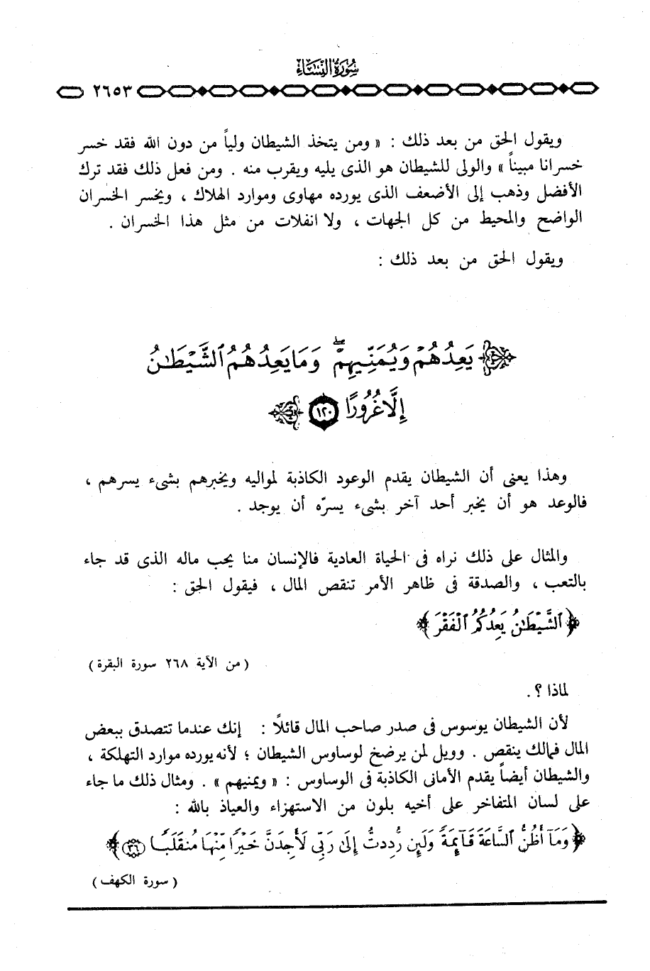 لأن الشيطان يوسوس في صدر صاحب المال قائلاً: إنك عندما تتصدق ببعض المال فمالك ينقص. وويل لمن يرضخ لوساوس الشيطان؛ لأنه يورده موارد التهلكة، والشيطان أيضاً يقدم الأماني الكاذبة في الوساوس: «ويمنيهم» . ومثال ذلك ما جاء على لسان المتفاخر على أخيه بلون من الاستهزاء والعياذ بالله: {وَمَآ أَظُنُّ الساعة قَائِمَةً وَلَئِن رُّدِدتُّ إلى رَبِّي لأَجِدَنَّ خَيْراً مِّنْهَا مُنْقَلَباً} [الكهف: 36]