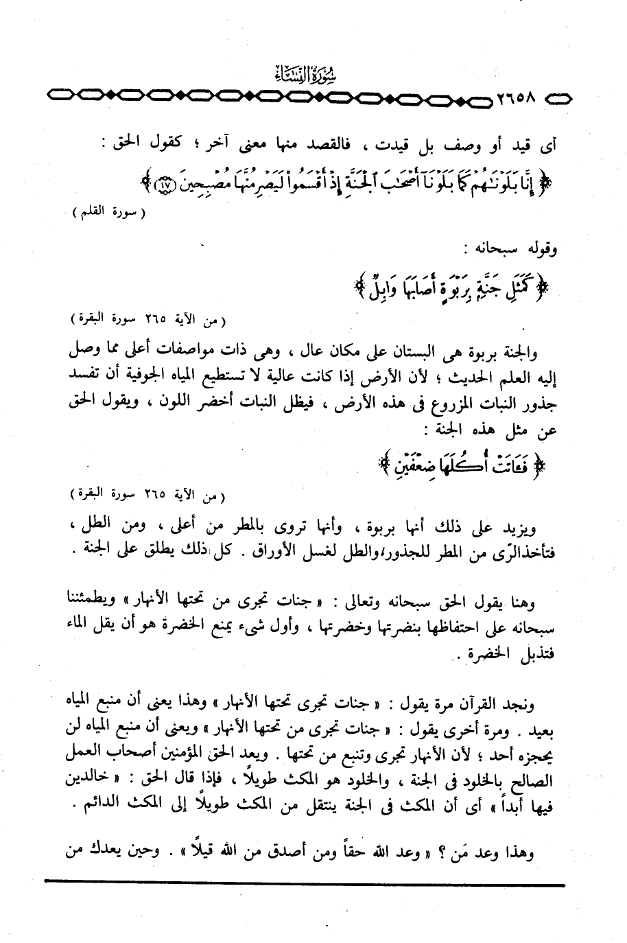 ونجد القرآن مرة يقول: {جَنَّاتٍ تَجْرِي تَحْتِهَا الأنهار} وهذا يعني أن منبع المياه بعيد. ومرة أخرى يقول: {جَنَّاتٍ تَجْرِي مِن تَحْتِهَا الأنهار} ويعني أن منبع المياه لن يحجزه أحد؛ لأن الأنهار تجري وتنبع من تحتها.