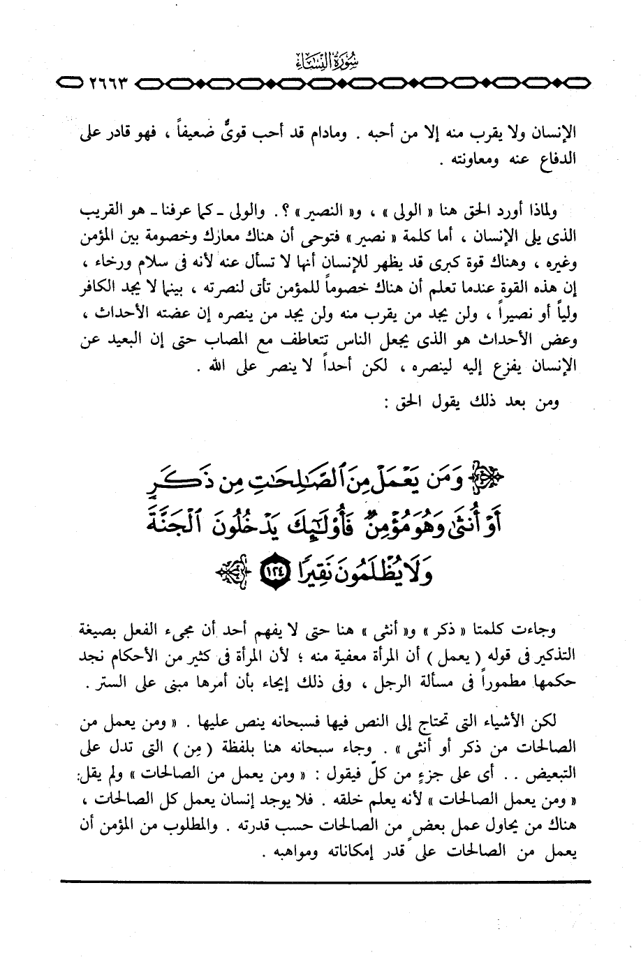 لكن الأشياء التي تحتاج إلى النص فيها فسبحانه ينص عليها. {وَمَن يَعْمَلْ مِنَ الصالحات مِن ذَكَرٍ أَوْ أنثى} . وجاء سبحانه هنا بلفظة (مِن) التي تدل على التبعيض. . أي على جزءٍ من كلّ فيقول: {وَمَن يَعْمَلْ مِنَ الصالحات} ولم يقل: «ومن يعمل الصالحات» لأنه يعلم خلقه. فلا يوجد إنسان يعمل كل الصالحات، هناك من يحاول عمل بعضٍ من الصالحات حسب قدرته. والمطلوب من المؤمن أن يعمل من الصالحات على قدر إمكاناته ومواهبه.