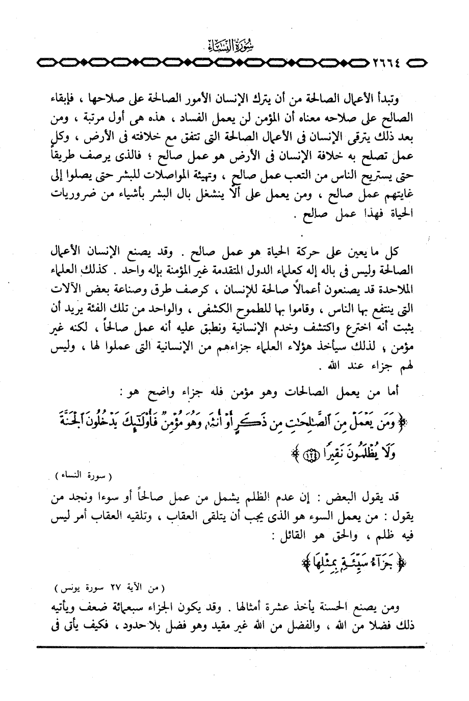 أما من يعمل الصالحات وهو مؤمن فله جزاء واضح هو: {وَمَن يَعْمَلْ مِنَ الصالحات مِن ذَكَرٍ أَوْ أنثى وَهُوَ مُؤْمِنٌ فأولئك يَدْخُلُونَ الجنة وَلاَ يُظْلَمُونَ نَقِيراً} [النساء: 124]