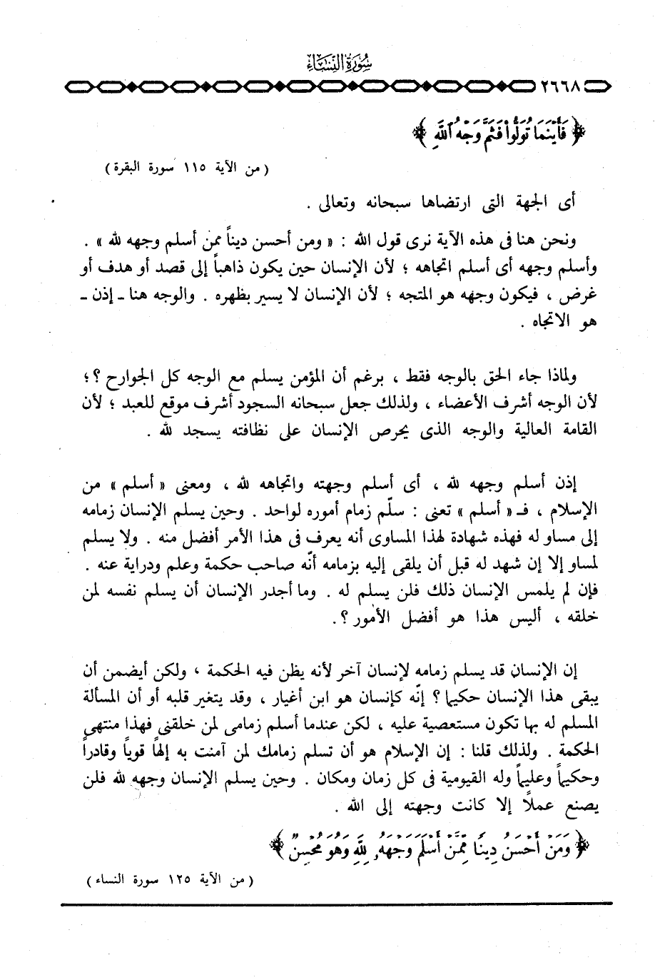 إن الإنسان قد يسلم زمامه لإنسان آخر لأنه يظن فيه الحكمة، ولكن أيضمن أن يبقى هذا الإنسان حكيماً؟ إنّه كإنسان هو ابن أغيار، وقد يتغير قلبه أو أن المسألة المسلم له لها تكون مستعصية عليه، لكن عندما أسلم زمامي لمن خلقني فهذا منتهى الحكمة. ولذلك قلنا: إن الإسلام هو أن تسلم زمامك لمن آمنت به إلهاً قوياً وقادراً وحكيماً وعليماً وله القيومية في كل زمان ومكان. وحين يسلم الإنسان وجهه لله فلن يصنع عملاً إلا كانت وجهته إلى الله. {وَمَنْ أَحْسَنُ دِيناً مِمَّنْ أَسْلَمَ وَجْهَهُ لله وَهُوَ مُحْسِنٌ} [النساء: 125]