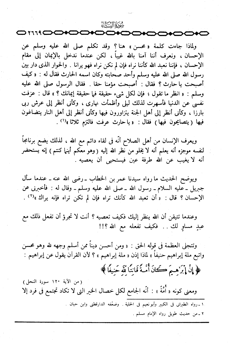 ولماذا جاءت كلمة «محسن» هنا؟ وقد تكلم صَلَّى اللَّهُ عَلَيْهِ وَسَلَّم َ عن الإحسان، ونعرف أننا آمنا بالله غيباً، لكن عندما ندخل بالإيمان إلى مقام الإحسان، فإننا نعبد الله كأننا نراه فإن لم نكن نراه فهو يرانا. «والحوار الذي دار بين رسول الله صَلَّى اللَّهُ عَلَيْهِ وَسَلَّم َ وأحد صحابته وكان اسمه الحارث فقال له:» كيف أصبحت يا حارث؟ فقال: أصبحت مؤمنا حقا. فقال رسول الله صَلَّى اللَّهُ عَلَيْهِ وَسَلَّم َ: «انظر ما تقول؛ فإن لكل شيء حقيقة فما حقيقة إيمانك؟» قال: عزفت نفسي عن الدنيا فأسهرت لذلك ليلي وأظمأت نهاري، وكأني أنظر إلى عرش ربي بارزا، وكأني أنظر إلى أهل الجنة يتزاورون فيها وكأني أنظر إلى أهل النار يتضاغون فيها (يتصايحون فيها) فقال: «يا حارث عرفت فالتزم ثلاثا» .