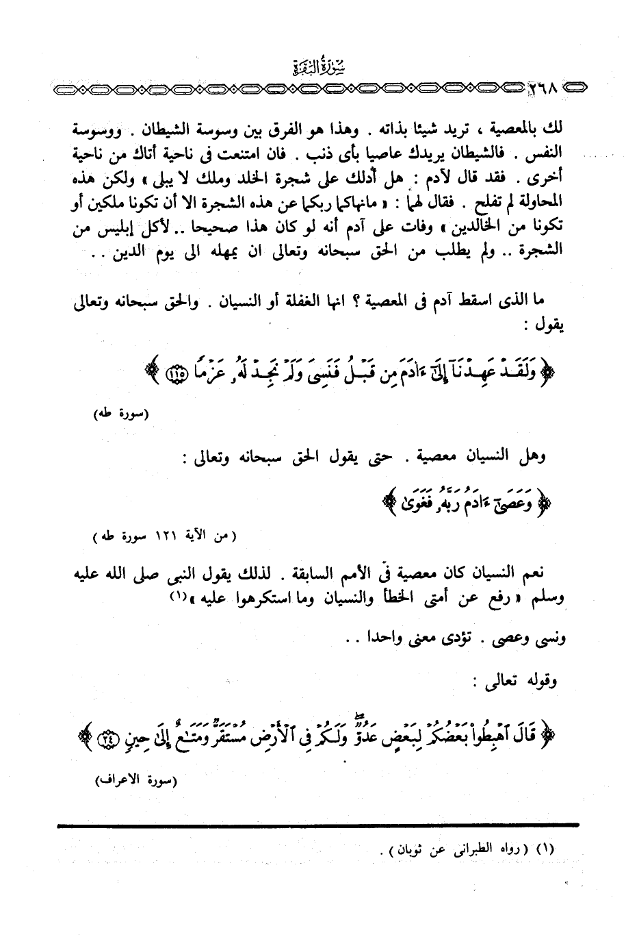 لك بالمعصية، تريد شيئا بذاته. وهذا هو الفرق بين وسوسة الشيطان. ووسوسة النفس. فالشيطان يريدك عاصيا بأي ذنب. فإن امتنعت في ناحية أتاك من ناحية أخرى. فقد قال لآدم: هل أدلك على شجرة الخلد وملك لا يبلى «ولكن هذه المحاولة لم تفلح. فقال لهما: {مَا نَهَاكُمَا رَبُّكُمَا عَنْ هذه الشجرة إِلاَّ أَن تَكُونَا مَلَكَيْنِ أَوْ تَكُونَا مِنَ الخالدين} وفات على آدم أنه لو كان هذا صحيحا. . لأكل إبليس من الشجرة. . ولم يطلب من الحق سبحانه وتعالى أن يمهله إلى يوم الدين. .