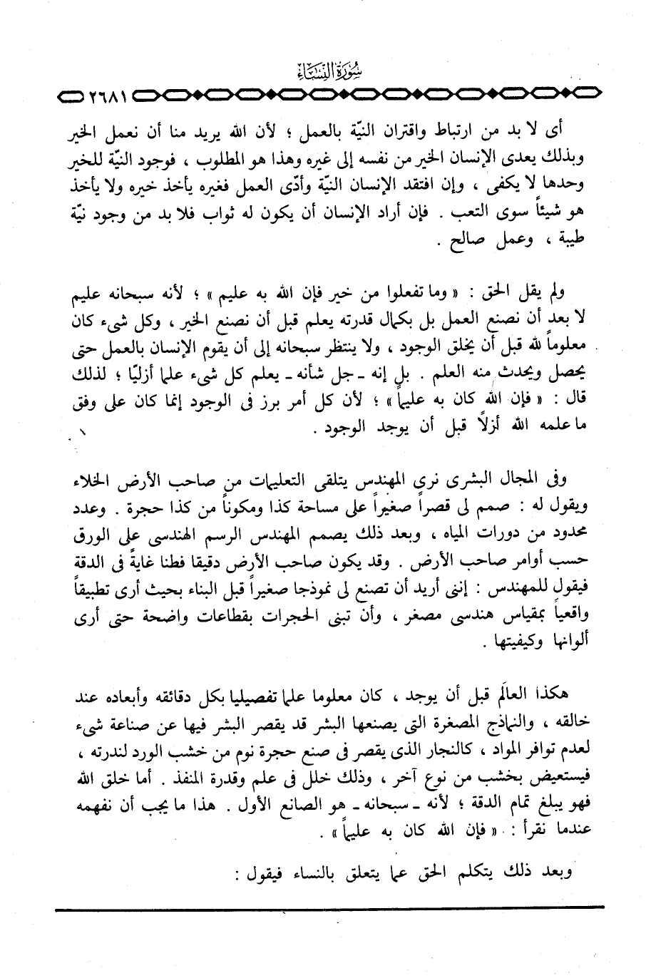هكذا العالَم قبل أن يوجد، كان معلوما علما تفصيليا بكل دقائقه وأبعاده عند خالقه، والنماذج المصغرة التي يصنعها البشر قد يقصر البشر فيها عن صناعة شيء لعدم توافر المواد، كالنجار الذي يقصر في صنع حجرة نوم من خشب الورد لندرته، فيستعيض بخشب من نوع آخر، وذلك خلل في علم وقدرة المنفذ. أما خلق الله فهو يبلغ تمام الدقة؛ لأنه - سبحانه - هو الصانع الأول. هذا ما يجب أن نفهمه عندما نقرأ: {فَإِنَّ الله كَانَ بِهِ عَلِيماً} .