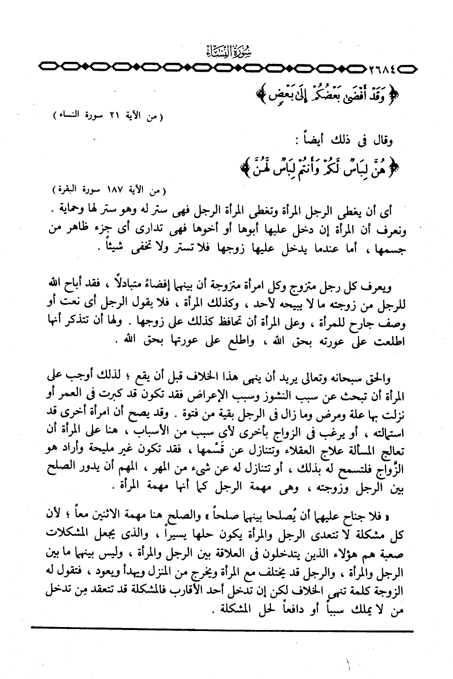 ويعرف كل زوج متزوج وكل امرأة متزوجة أن بينهما إفضاءً متبادلاً، فقد أباح الله للرجل من زوجته ما لا يبيحه لأحد، وكذلك المرأة، فلا يقول الرجل أي نعت أو وصف جارح للمرأة، وعلى المرأة أن تحافظ كذلك على زوجها. ولها أن تتذكر أنها اطلعت على عورته بحق الله، واطلع على عورتها بحق الله.
