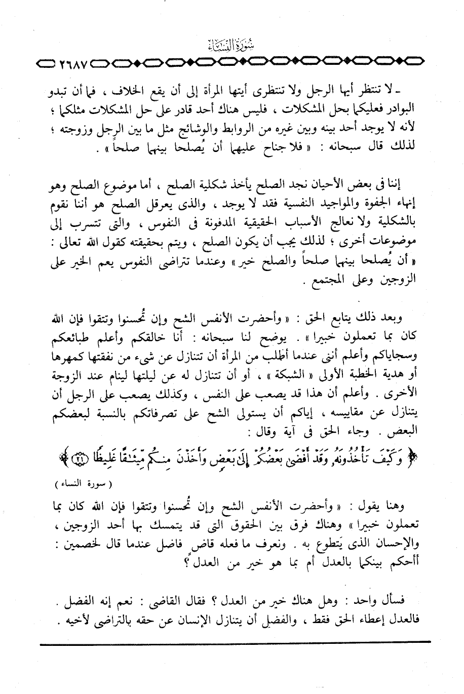 وبعد ذلك يتابع الحق: {وَأُحْضِرَتِ الأنفس الشح وَإِن تُحْسِنُواْ وَتَتَّقُواْ فَإِنَّ الله كَانَ بِمَا تَعْمَلُونَ خَبِيراً} . يوضح لنا سبحانه: أنا خالقكم وأعلم طبائعكم وسجاياكم وأعلم أنني عندما أطلب من المرأة أن تتنازل عن شيء من نفقتها كمهرها أو هدية الخطبة الأولى «الشبكة» ، أو أن تتنازل له عن ليلتها لينام عند الزوجة الأخرى. وأعلم أن هذا قد يصعب على النفس، وكذلك يصعب على الرجل أن يتنازل عن مقاييسه، إياكم أن يستولي الشح على تصرفاتكم بالنسبة لبعضكم البعض. وجاء الحق في آية وقال: {وَكَيْفَ تَأْخُذُونَهُ وَقَدْ أفضى بَعْضُكُمْ إلى بَعْضٍ وَأَخَذْنَ مِنكُم مِّيثَاقاً غَلِيظاً} [النساء: 21]