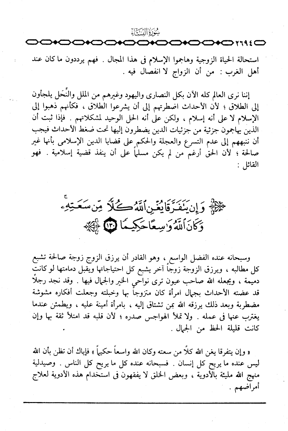 {وَإِن يَتَفَرَّقَا يُغْنِ الله كُلاًّ مِّن سَعَتِهِ وَكَانَ الله وَاسِعاً حَكِيماً} فإياك أن تظن بأن الله ليس عنده ما يريح كل إنسان. فسبحانه عنده كل ما يريح كل الناس. وصيدلية منهج الله مليئة بالأدوية، وبعض الخلق لا يفقهون في استخدام هذه الأدوية لعلاج أمراضهم.