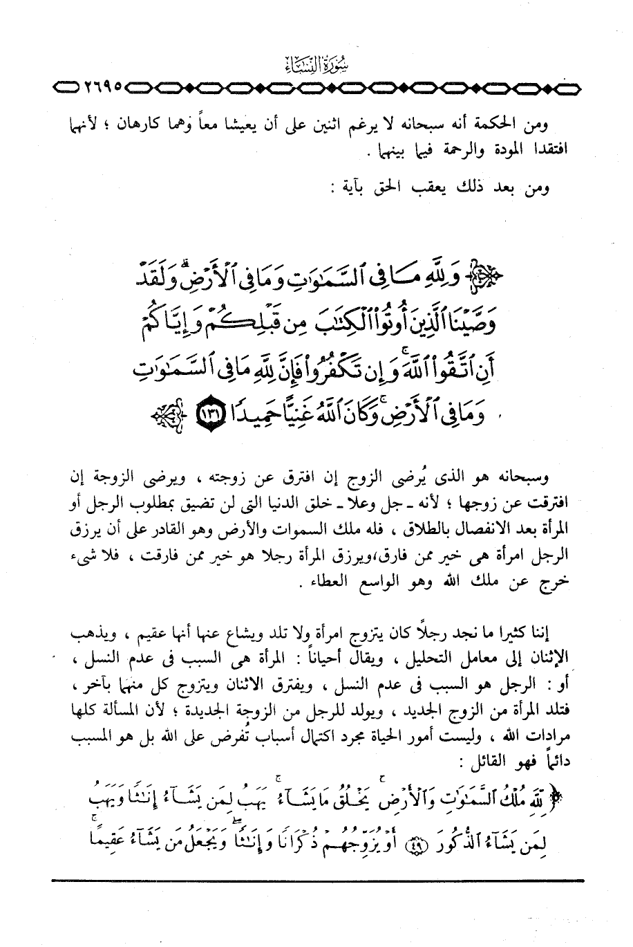 وسبحانه هو الذي يُرضي الزوج إن افترق عن زوجته، ويرضي الزوجة إذا افترقت عن زوجها؛ لأنه - جل وعلا - خلق الدنيا التي لن تضيق بمطلوب الرجل أو المرأة بعد الانفصال بالطلاق، فله ملك السموات والأرض وهو القادر على أن يرزق الرجل امرأة هي خير ممن فارق، ويرزق المرأة رجلا هو خير ممن فارقت، فلا شيء خرج عن ملك الله وهو الواسع العطاء.