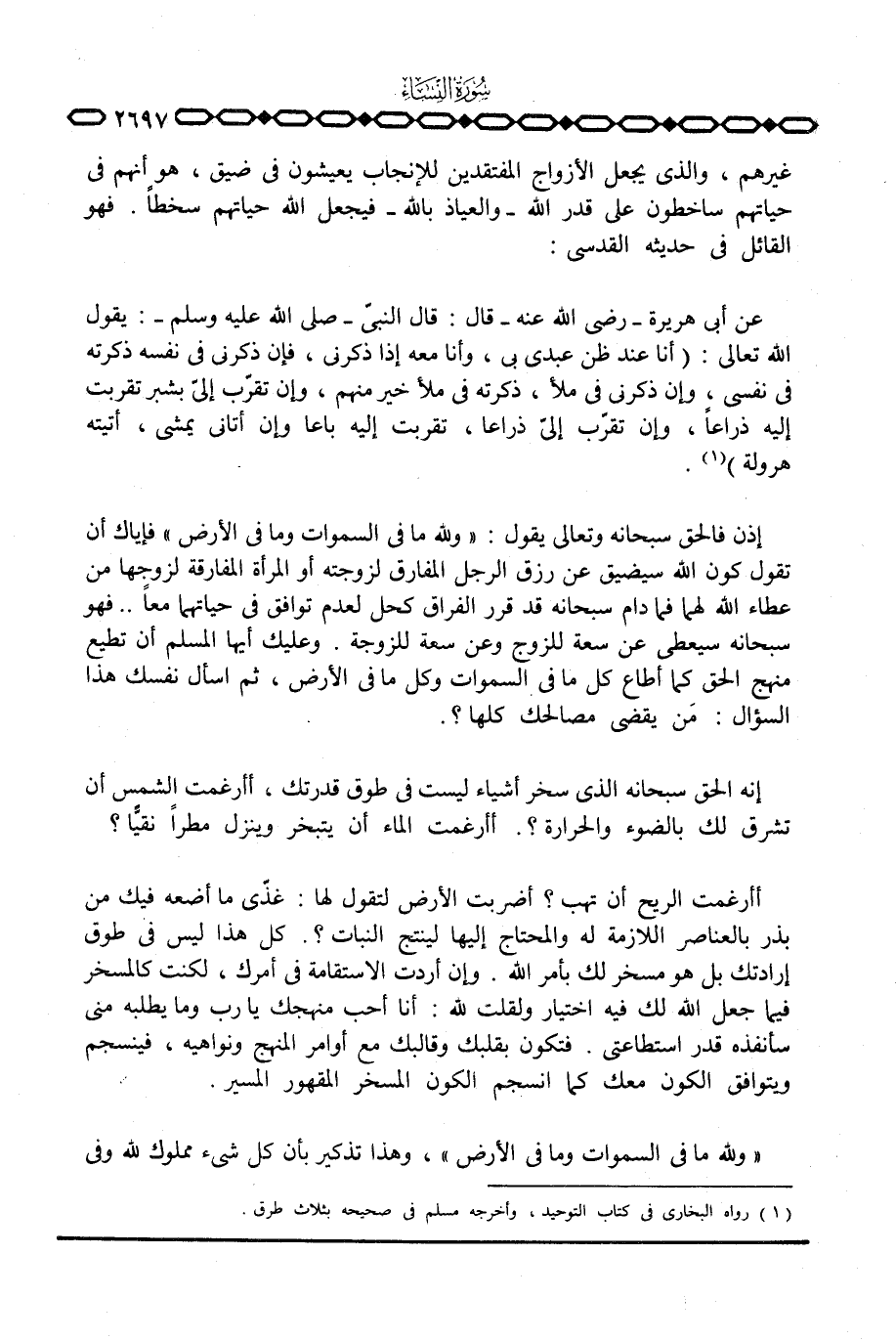 إذن فالحق سبحانه وتعالى يقول: {وَللَّهِ مَا فِي السماوات وَمَا فِي الأرض} فإياك أن تقول كون الله سيضيق عن رزق الرجل المفارق لزوجته أو المرأة المفارقة لزوجها من عطاء الله لهما فما دام سبحانه قد قرر الفراق كحل لعدم توافق في حياتهما معاً. . فهو سبحانه سيعطي عن سعة للزوج وعن سعة للزوجة. وعليك أيها المسلم أن تطيع منهج الحق كما أطاع كل ما في السموات وكل ما في الأرض، ثم اسأل نفسك هذا السؤال: مَن يقضي مصالحك كلها؟ .