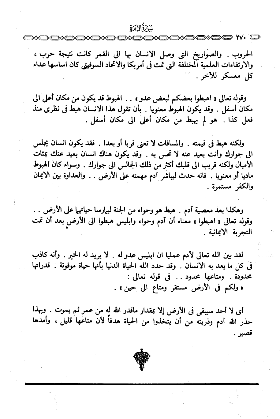 ولكنه هبط في قيمته. والمسافات لا تعني قربا أو بعدا. فقد يكون إنسان يجلس إلى جوارك وأنت بعيد عنه لا تحس به. وقد يكون هناك إنسان بعيد عنك بمئات الأميال ولكنه قريب إلى قلبك أكثر من ذلك الجالس إلى جوارك. وسواء كان الهبوط ماديا أو معنويا. فإنه حدث ليباشر آدم مهمته على الأرض. . والعداوة بين الإيمان والكفر مستمرة.