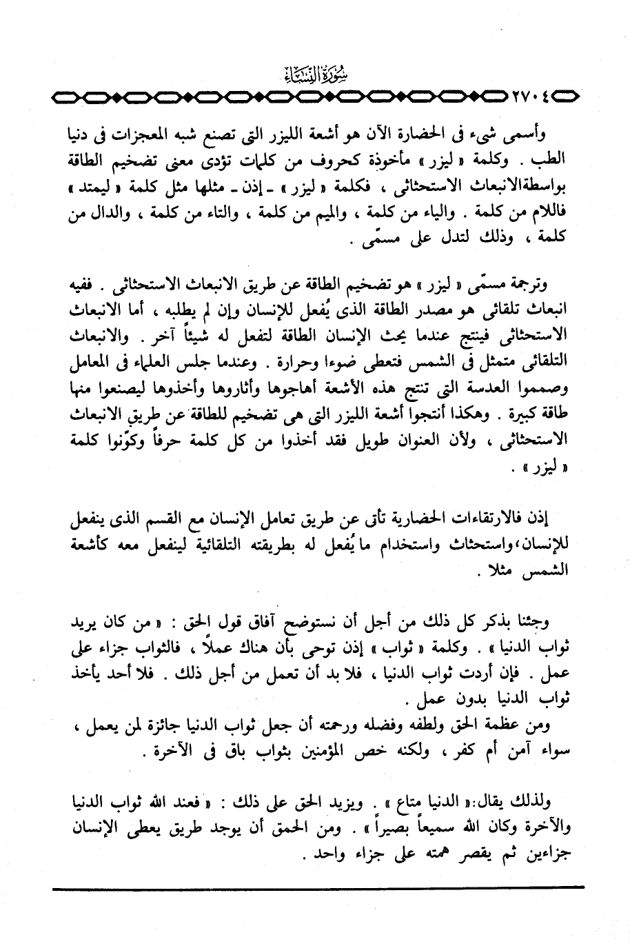 وأسمى شيء في الحضارة الآن هو أشعة الليزر التي تصنع شبه المعجزات في دنيا الطب. وكلمة «ليزر» مأخوذة كحروف من كلمات تؤدي معنى تضخيم الطاقة بواسطة الانبعاث الاستحثائي، فكلمة «ليزر» - إذن - مثلها كلمة «ليمتد» فاللام من كلمة.