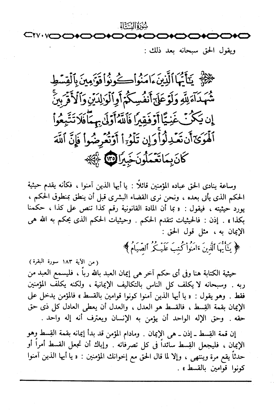 إن قمة القِسط - إذن - هي الإيمان. ومادام المؤمن قد بدأ إيمانه بقمة القِسط وهو الإيمان، فليجعل القِسط سائداً في كل تصرفاته. وإياك أن تجعل القسط أمراً أو حدثاً يقع مرة وينتهي، وإلا لما قال الحق مع إخوانك المؤمنين: {يَا أَيُّهَا الذين آمَنُواْ كُونُواْ قَوَّامِينَ بالقسط} .