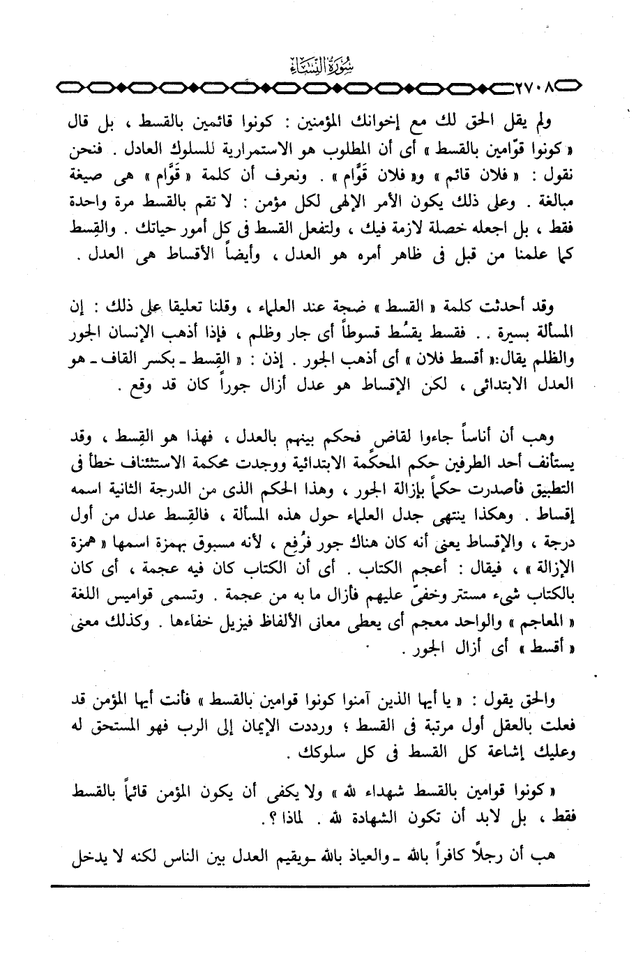 ولم يقل الحق لك مع إخوانك المؤمنين: كونوا قائمين بالقسط، بل قال {كُونُواْ قَوَّامِينَ بالقسط} أي أن المطلوب هو الاستمرارية للسلوك العادل. فنحن نقول: «فلان قائم» و «فلان قَوَّام» . ونعرف أن كلمة «قَوَّام» هي صيغة مبالغة. وعلى ذلك يكون الأمر الألهي لكل مؤمن: لا تقم بالقسط مرة واحدة فقط، بل اجعله خصلة لازمة فيك، ولتفعل القسط في كل أمور حياتك. والقِسط كما علمنا من قبل في ظاهر أمره هو العدل، وأيضاً الأقساط هي العدل.