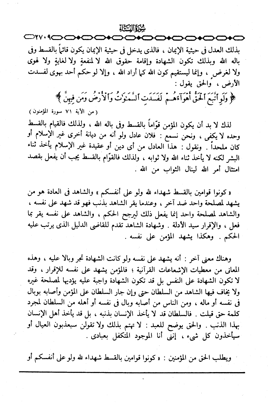 بذلك العدل في حيثية الإيمان، فالذي يدخل في حيثية الإيمان يكون قائماً بالقسط وفي باله الله وبذلك تكون الشهادة وإقامة حقوق الله لا لمنفعةٍ ولا لغايةٍ ولا لهوى ولا لغرضٍ، وإنما ليستقيم كون الله كما أراد الله، وإلا لو حكم أحد بهوى لفسدت الأرض، والحق يقول: {وَلَوِ اتبع الحق أَهْوَآءَهُمْ لَفَسَدَتِ السماوات والأرض وَمَن فِيهِنَّ} [المؤمنون: 71]
