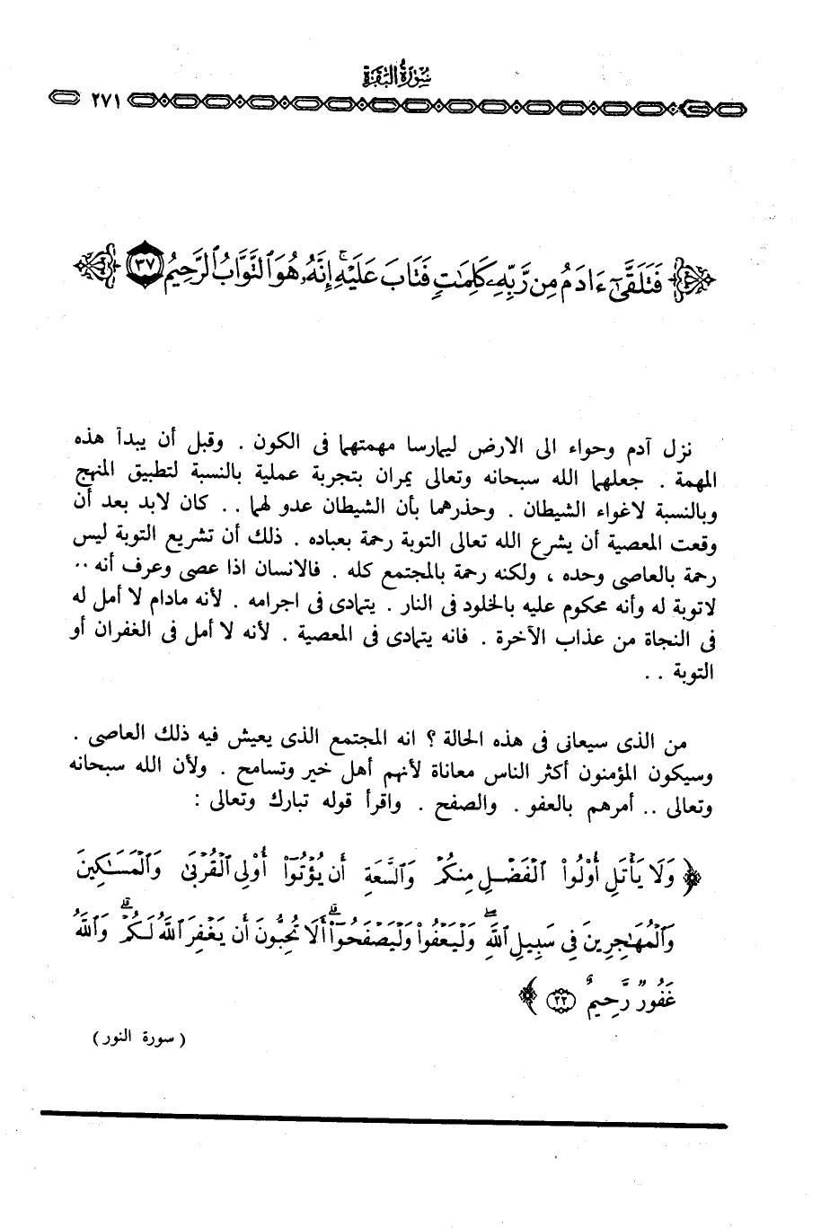 نزل آدم وحواء إلى الأرض ليمارسا مهمتهما في الكون. وقبل أن يبدآ هذه المهمة. جعلهما الله سبحانه وتعالى يمران بتجربة عملية بالنسبة لتطبيق المنهج وبالنسبة لإغواء الشيطان. وحذرهما بأن الشيطان عدو لهما. . كان لابد بعد أن وقعت المعصية أن يشرع الله تعالى التوبة رحمة بعباده. ذلك أن تشريع التوبة ليس رحمة بالعاصي وحده، ولكنه رحمة بالمجتمع كله. فالإنسان إذا عصى وعرف أنه. . لا توبة له وأنه محكوم عليه بالخلود في النار. يتمادى في إجرامه. لأنه مادام لا أمل له في النجاة من عذاب الآخرة. فإنه يتمادى في المعصية. لأنه لا أمل في الغفران أو التوبة. .