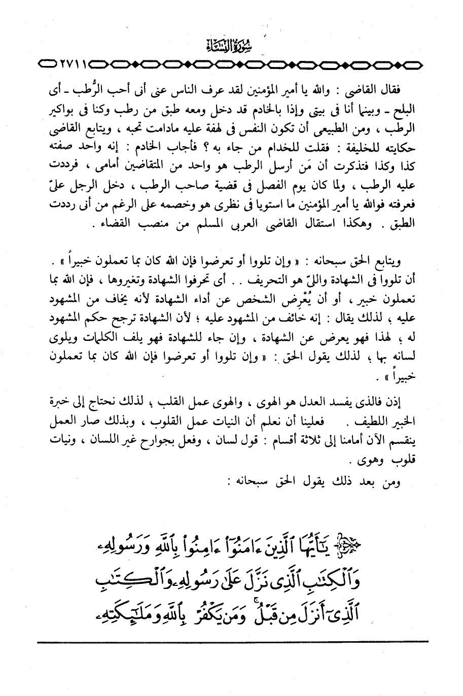 إذن فالذي يفسد العدل هو الهوى، والهوى عمل القلب؛ لذلك نحتاج إلى خبرة الخبير اللطيف. فعلينا أن نعلم أن النيات عمل القلوب، وبذلك صار العمل ينقسم الآن أمامنا إلى ثلاثة أقسام: قول لسان، وفعل بجوارح غير اللسان، ونيات قلوب وهوى.