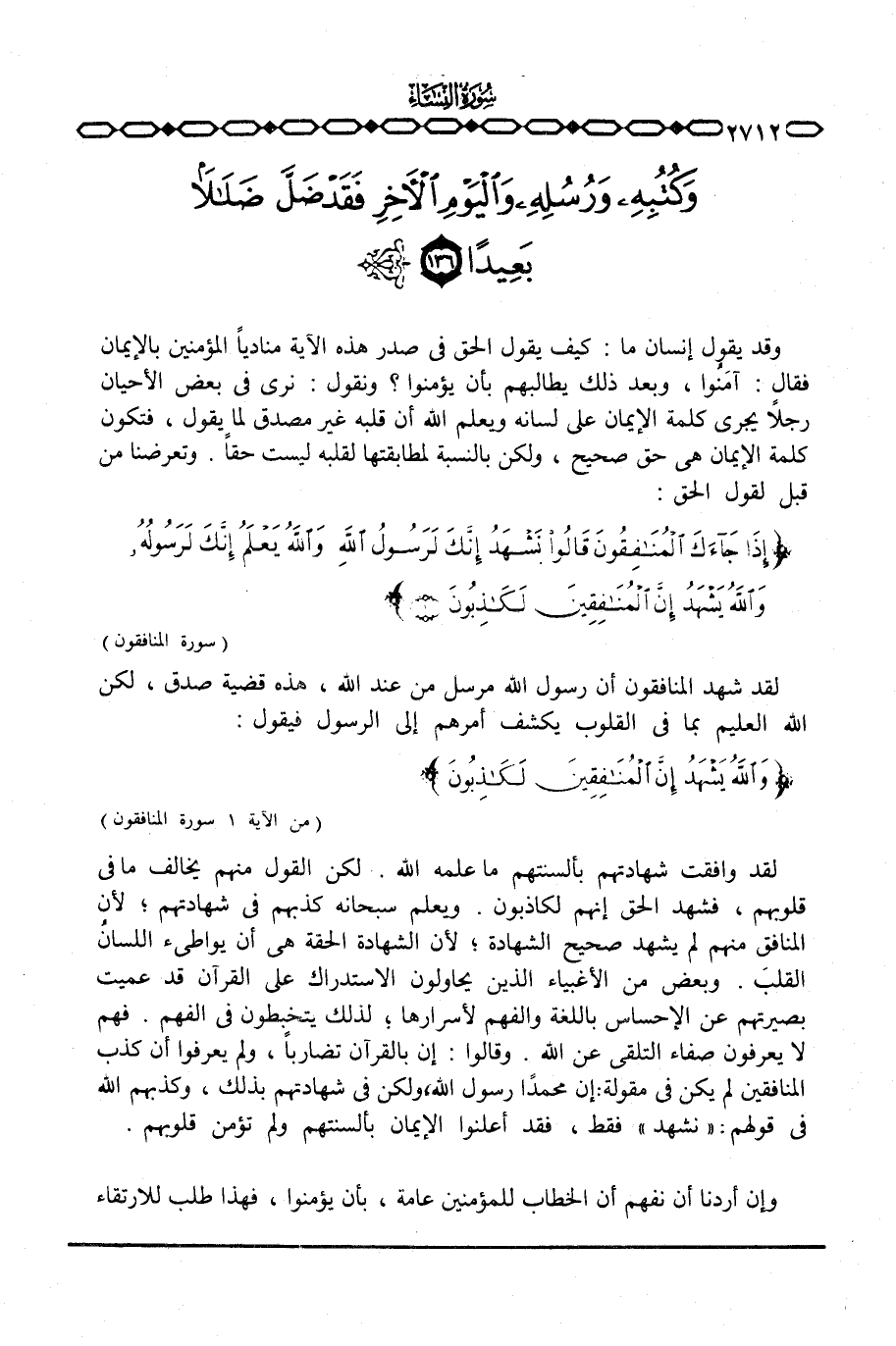 لقد وافقت شهادتهم بألسنتهم ما علمه الله. لكن القول منهم يخالف ما في قلوبهم، فشهد الحق إنهم لكاذبون. ويعلم سبحانه كذبهم في شهادتهم؛ لأن المنافق منهم لم يشهد صحيح الشهادة؛ لأن الشهادة الحقة هي أن يواطئ اللسانُ القلبَ. وبعض من الأغبياء الذين يحاولون الاستدراك على القرآن قد عميت بصيرتهم عن الإحساس باللغة والفهم لأسرارها؛ لذلك يتخبطون في الفهم. فهم لا يعرفون صفاء التلقي عن الله. وقالوا: إن بالقرآن تضارباً، ولم يعرفوا أن كذب المنافقين لم يكن في مقولة: إن محمداً رسول الله، ولكن في شهادتهم بذلك، وكذبهم الله في قولهم: «نشهد» فقط، فقد أعلنوا الإيمان بألسنتهم ولم تؤمن قلوبهم.