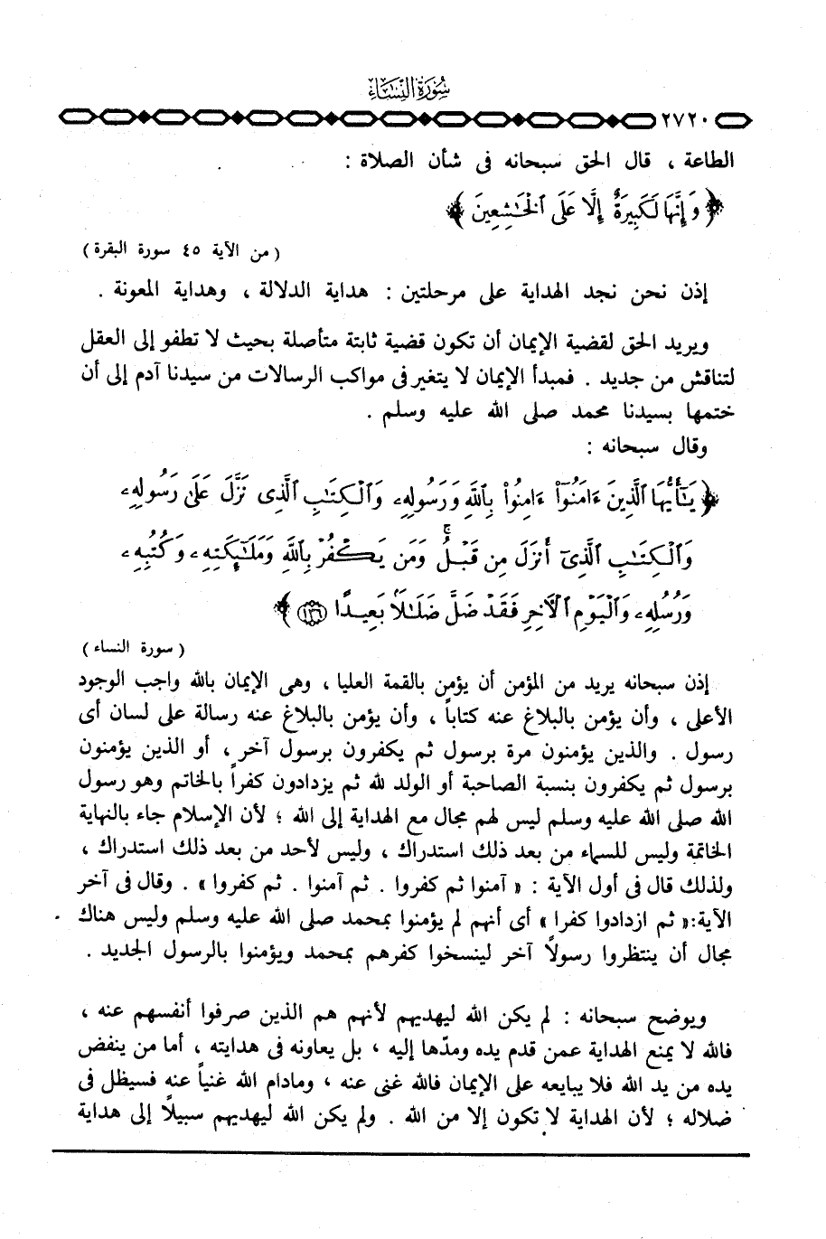 ويريد الحق لقضية الإيمان أن تكون قضية ثابتة متأصلة بحيث لا تطفو إلى العقل لتناقش من جديد. فمبدأ الإيمان لا يتغير في مواكب الرسالات من سيدنا آدم إلى أن ختمها بسيدنا محمد صَلَّى اللَّهُ عَلَيْهِ وَسَلَّم َ.