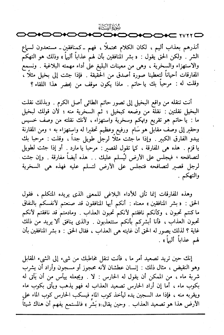 أنذرهم بعذاب أليم، لكان الكلام محتملاً، فهم - كمنافقين - مستعدون لسماع الشر. ولكن الحق يقول: {بَشِّرِ المنافقين بِأَنَّ لَهُمْ عَذَاباً أَلِيماً} وذلك هو التهكم والاستهزاء والسخرية، وهي من معينات البليغ على أداء مهمته البلاغية. ونسمع المفارقات أحياناً لتعطينا صورة أصدق من الحقيقة. فإذا جئت إلى بخيل مثلاً، وقلت له: مرحباً بك يا حاتم. ماذا يكون موقف من يحضر هذا اللقاء؟
