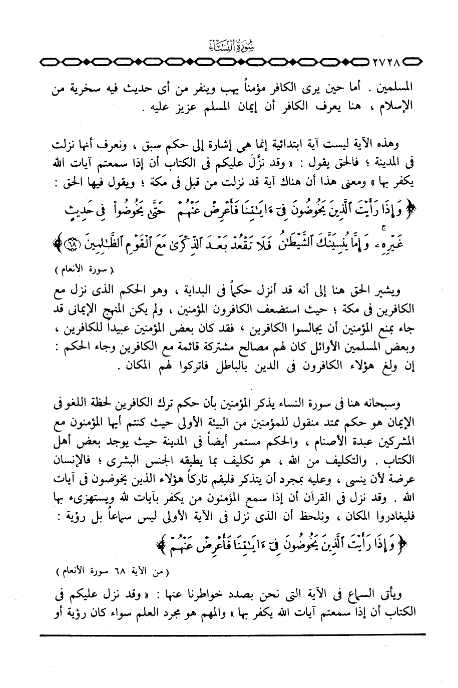 وهذه الآية ليست آية ابتدائية إنما هي إشارة إلى حكم سبق، ونعرف أنها نزلت في المدينة؛ فالحق يقول: {وَقَدْ نَزَّلَ عَلَيْكُمْ فِي الكتاب أَنْ إِذَا سَمِعْتُمْ آيَاتِ الله يُكْفَرُ بِهَا} ومعنى هذا أن هناك آية قد نزلت من قبل في مكة؛ ويقول فيها الحق: {وَإِذَا رَأَيْتَ الذين يَخُوضُونَ في آيَاتِنَا فَأَعْرِضْ عَنْهُمْ حتى يَخُوضُواْ فِي حَدِيثٍ غَيْرِهِ وَإِمَّا يُنسِيَنَّكَ الشيطان فَلاَ تَقْعُدْ بَعْدَ الذكرى مَعَ القوم الظالمين} [الأنعام: 68]