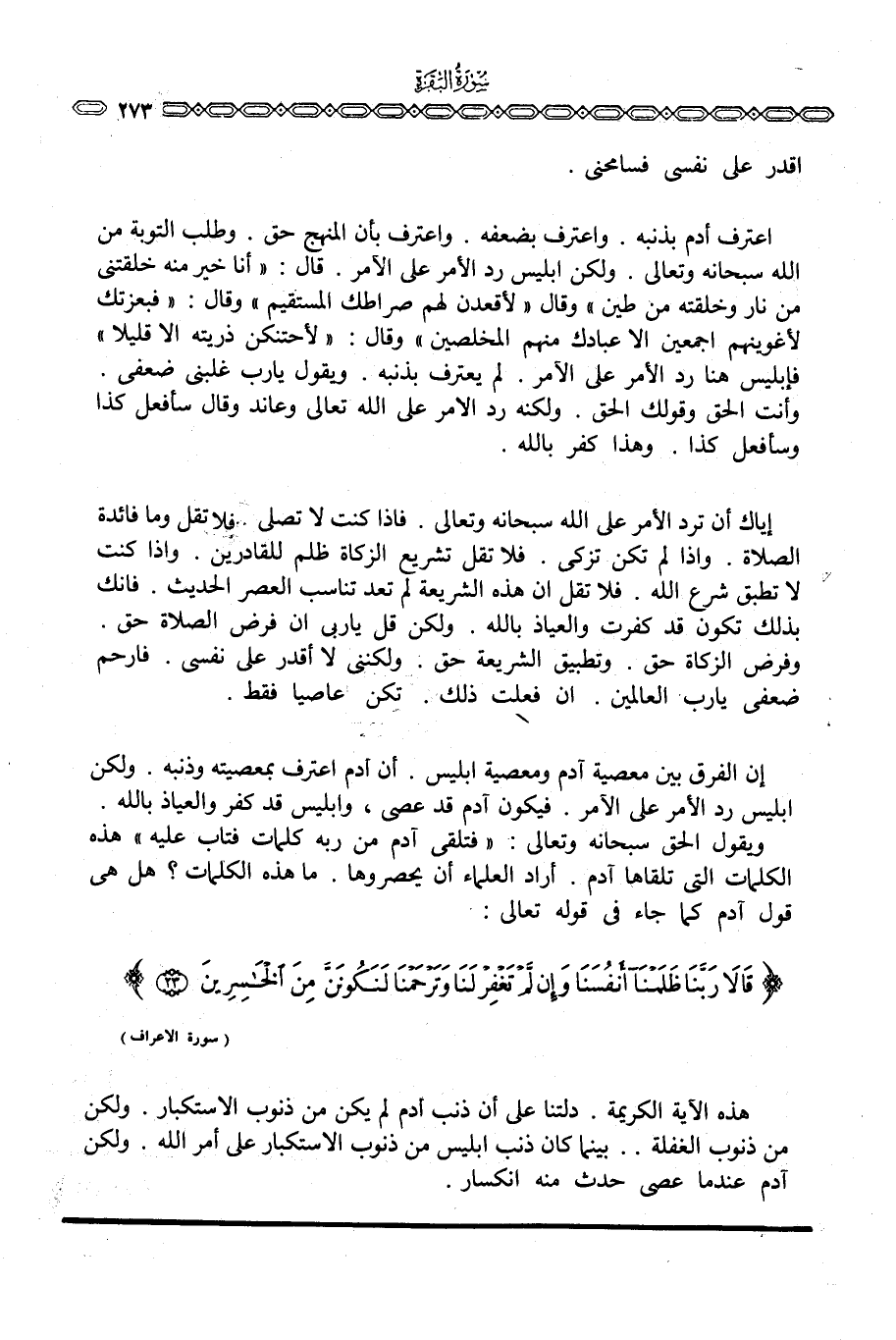 إياك أن ترد الأمر على الله سبحانه وتعالى. فإذا كنت لا تصلي. . فلا تقل وما فائدة الصلاة. وإذا لم تكن تزكي. فلا تقل تشريع الزكاة ظلم للقادرين. وإذا كنت لا تطبق شرع الله. فلا تقل أن هذه الشريعة لم تعد تناسب العصر الحديث. فإنك بذلك تكون قد كفرت والعياذ بالله. ولكن قل يا ربي إن فرض الصلاة حق. وفرض الزكاة حق. وتطبيق الشريعة حق. ولكنني لا أقدر على نفسي. فارحم ضعفي يا رب العالمين. إن فعلت ذلك. تكن عاصيا فقط.